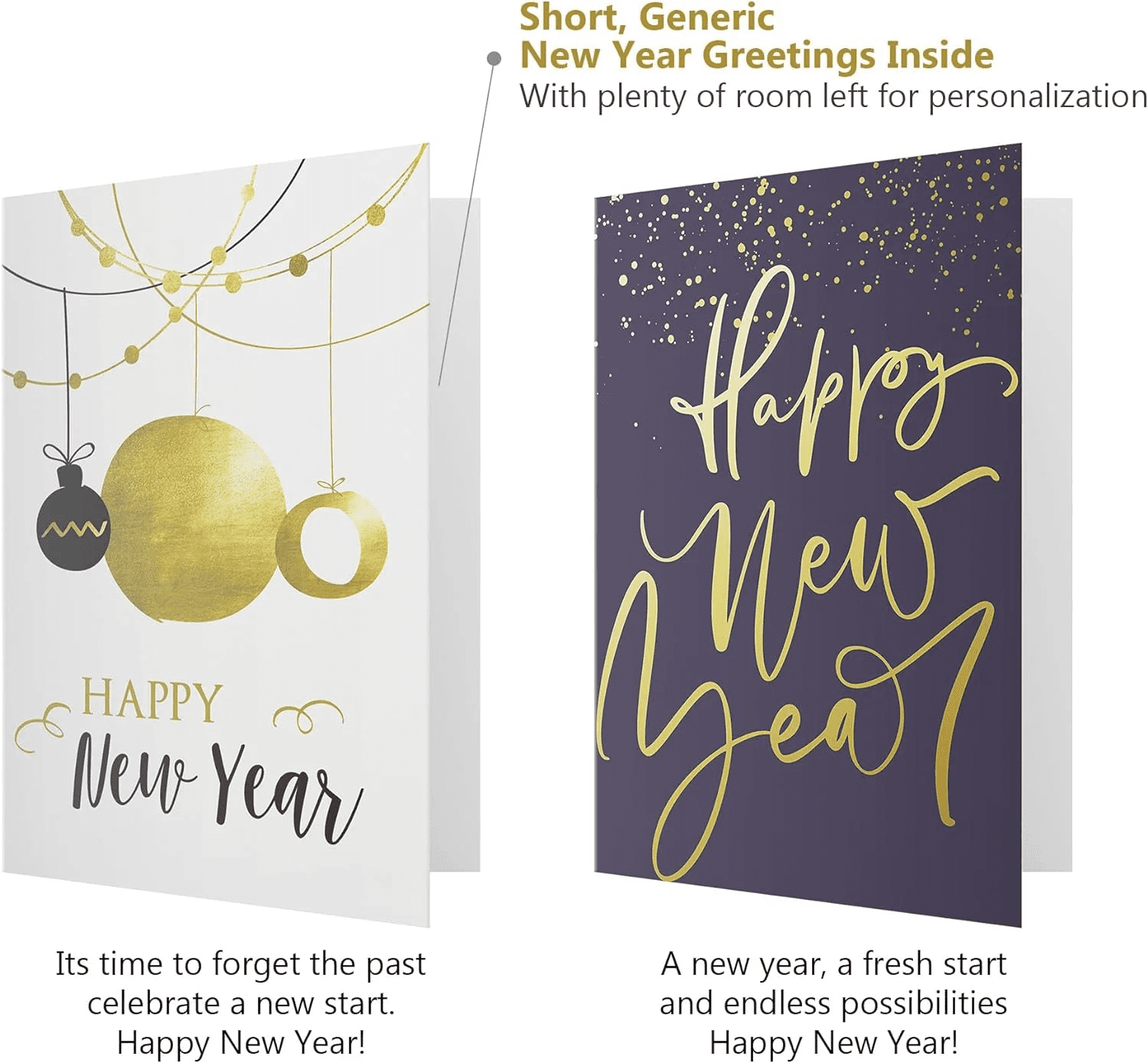 - Luxurious Happy New Year Cards: Start the new year off right with these Dessie 30 Happy New Year Cards with Gold Foil.Each card is beautifully designed in vibrant colors to bring joy and happiness to the recipient.