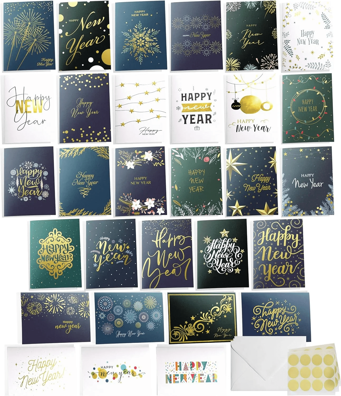 - Complete Set: Not only do you get 30 different new year greeting cards with envelopes, but you also get 32 white envelopes.This boxed new years cards set provides everything you need.