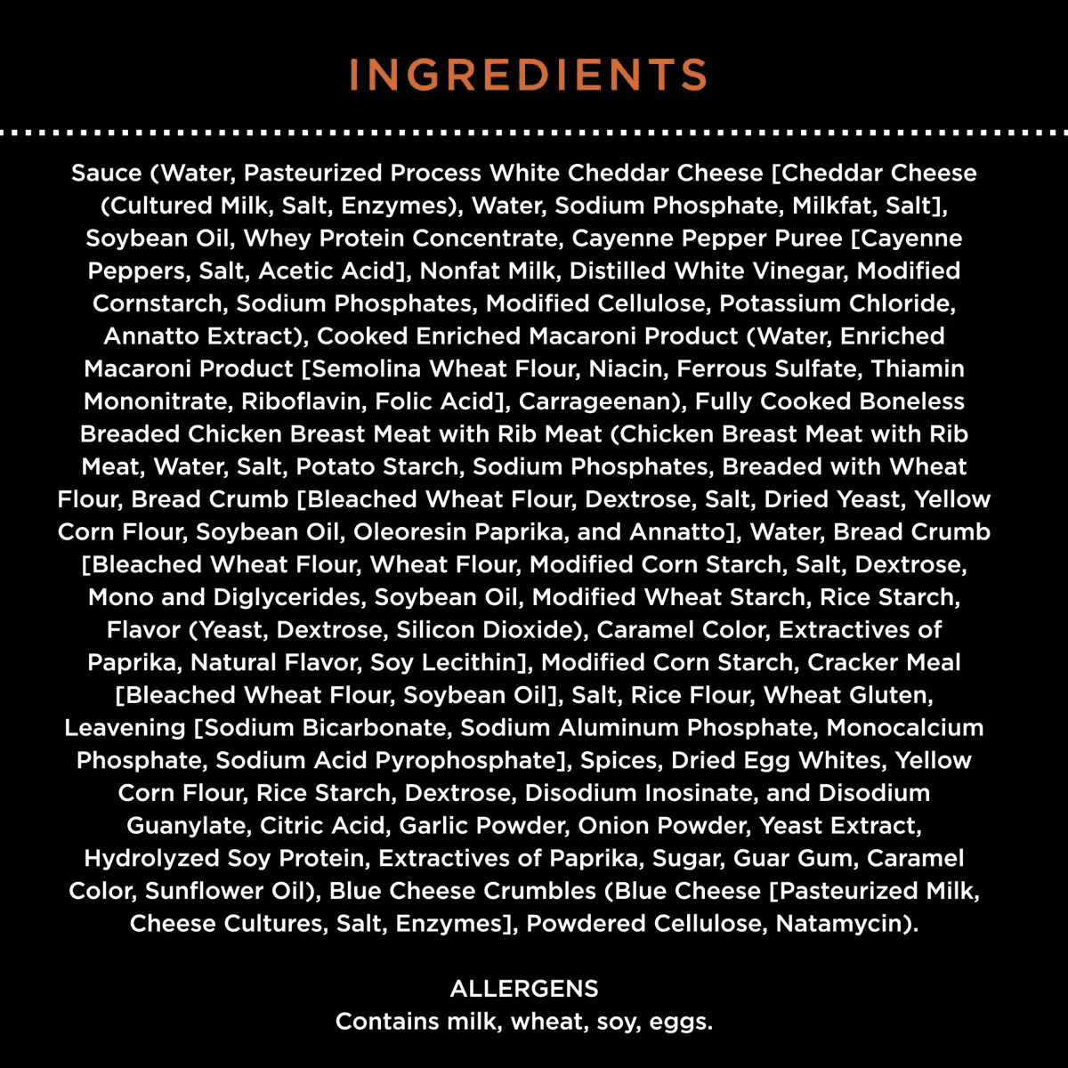 - Contains pasta shells with buffalo style cheddar sauce, crispy breaded chicken and rich blue cheese, for a robust frozen dinner