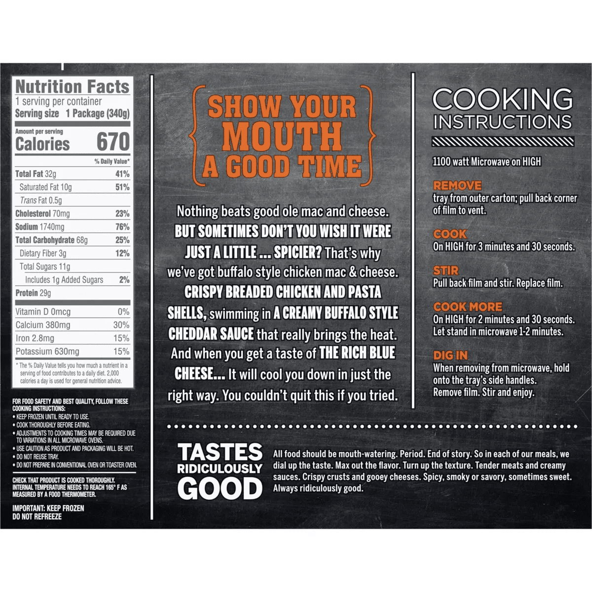 - One 12 oz box of DEVOUR Buffalo Style Chicken Mac & Cheese Frozen Meal