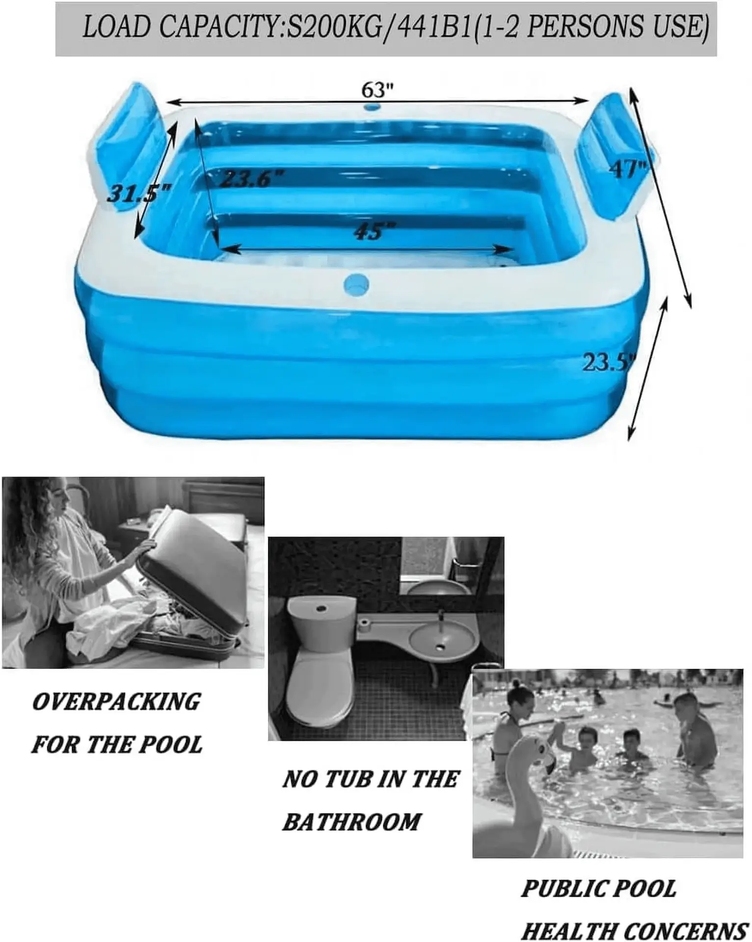 - 【 】 : This foldable adult blow up pool can accommodate 2 persons together. Bathing helps eliminate toxins from the body and improves overall health.Portable pool make the SPA and bath more enjoyable,Will come with electirc air pump, only few minute to inflate the tub, to protect the tub, we recommend to fill 90% air full in.After adding water, the tub will be more stable, and the tub will not tilt and cause water leakage when taking a bath.