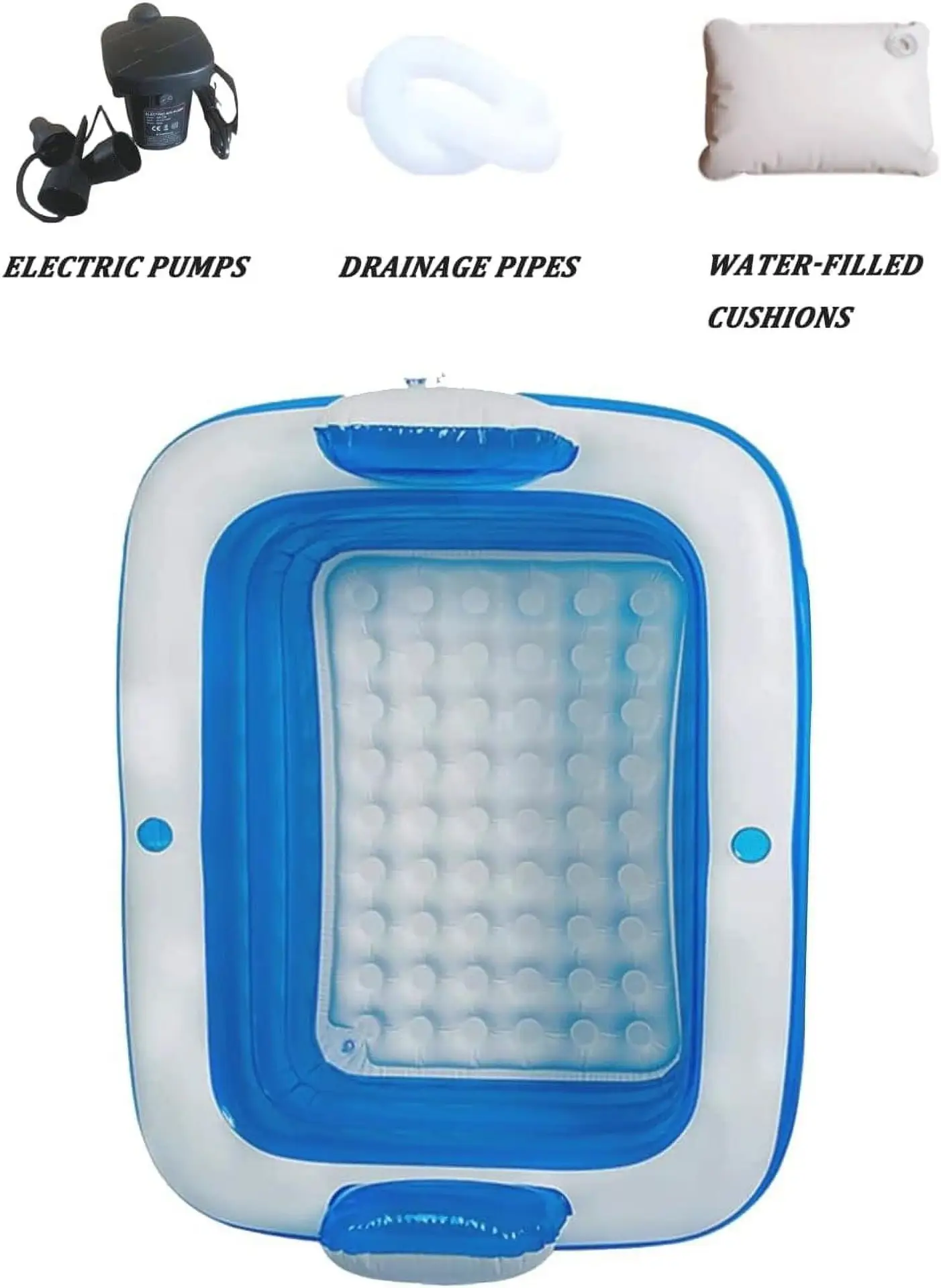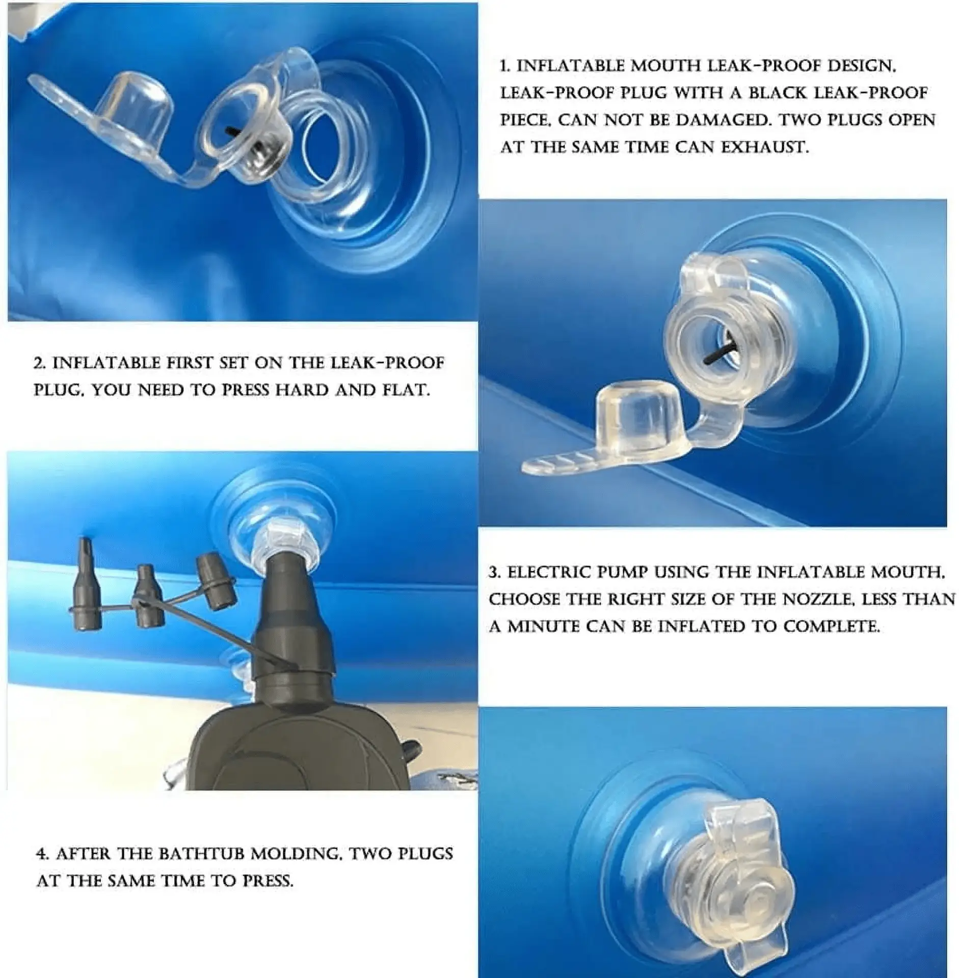 Warm Tips.The bathtub needs to be placed on a flat place that is safe to useCheck that there are no sharp objects on the floor before use to avoid puncturing the tub.It is recommended to dry or dry the bathtub before folding and storingWarm but not boiling water temperature is the best choice.Supplied with an electric pump and a unique nozzle, you can inflate your tub in less than 3 minutes!Quick drainage: double drainage pipes for efficient drainage.Drain plug: open the drain plug at the bottom of the inflatable bathtub for quick drainage.About adding water, I recommend only filling to the second layer moreDry storage after use is beneficial for longer use.It is recommended to connect the drain hose to the bottom before adding water.Portable bathtub adultPerfect for bathrooms without a bathtub!