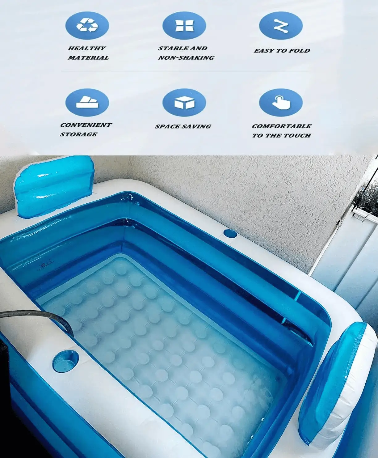 The bathtub has the look while maintaining optimum performance to give you a spa pool-like bathtub experience. Not only will this bathtub look great in your home, but it has been designed with comfort in mind. the bathtub is equipped with oversized arms and backrests, an inflatable floor and a triple inflatable design that provides cushioning for all parts of your body. We also have a bath pillow that you can use as a seat or for lumbar support.The portable bathtub for adults is suitable for all seasons, hot bath in winter and ice bath in summer.