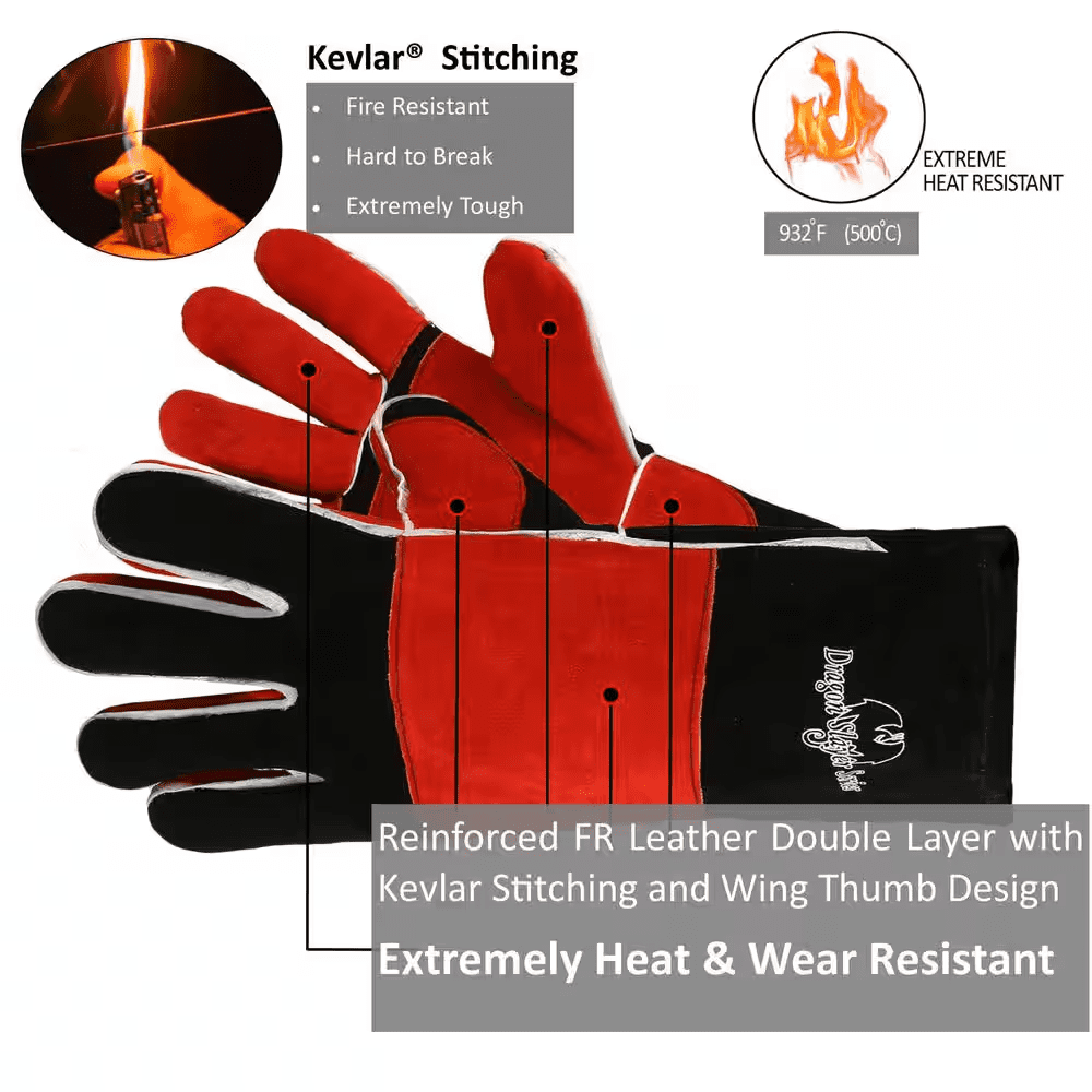 Experience ultimate protection with our premium welding gloves, expertly crafted from heat and flame-resistant leather. Designed to withstand extreme heat up to 932°f, these 14 in. Gloves feature double-reinforced KEVLAR padding on the fingers, palms, elbows, and backs. All seams are sewn with heat-resistant KEVLAR thread to ensure superior durability and heat resistance. Built with tough cow fr leather, these heavy-duty gloves provide long-lasting protection for your hands and forearms in the harshest environments. The outer layer boasts double-layered fr leather padding, while the intermediate layer consists of high-temperature resistant aluminum foil and flame-retardant cotton cloth. Inside, a soft flame-retardant cotton liner ensures comfort and insulation. Perfect for welding, animal handling, grilling, and more, our gloves offer unmatched performance and safety. Try them today and see how they outperform other gloves on the market.