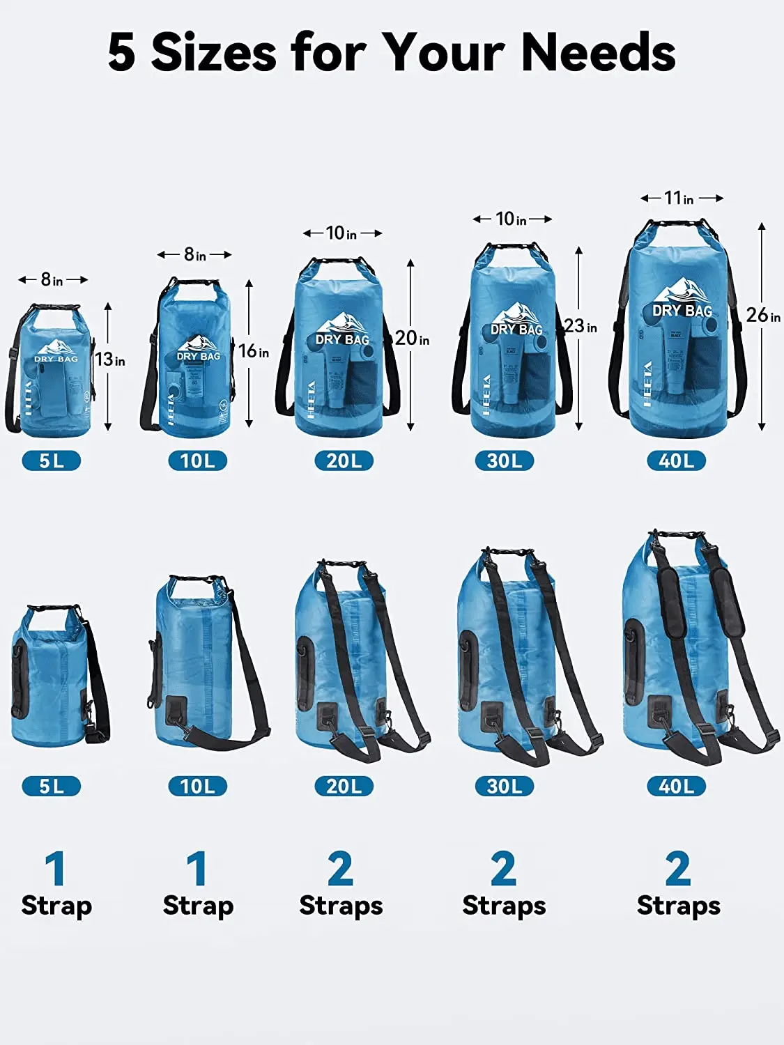 - 5 Sizes (5L/ 10L/ 20L/ 30L/ 40L) to choose – Great beach vacation and cruise ship essentials, a right choice for the gift to women and men, each bag comes with a free waterproof cell phone case, bring comprehensive waterproof protection to your water sports. You can control the size of the dry bag by the number of times you roll the top edge