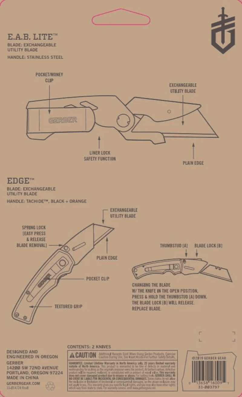 The Gerber Gear EAB (Exchange-A-Blade) Lite pocket knife employs contractor grade utility blades that can easily be replaced, keeping you ready and on the go. A stainless-steel body and liner lock construction keep this tool sturdy and stable while in use. The EAB Lite sports a handle that doubles as a pocket or money clip, ever ready and always on hand. The Gerber Gear Edge utility knife is loaded with on-the-site features including a spring lock for easy press and release blade replacement, a pocket clip for easy carry, and a readily available, easy to open utility blade. The contractor grade utility blades can easily be replaced, keeping you ready and on the go. And no matter what, every product that bears the Gerber Gear name is backed by our famous lifetime warranty.