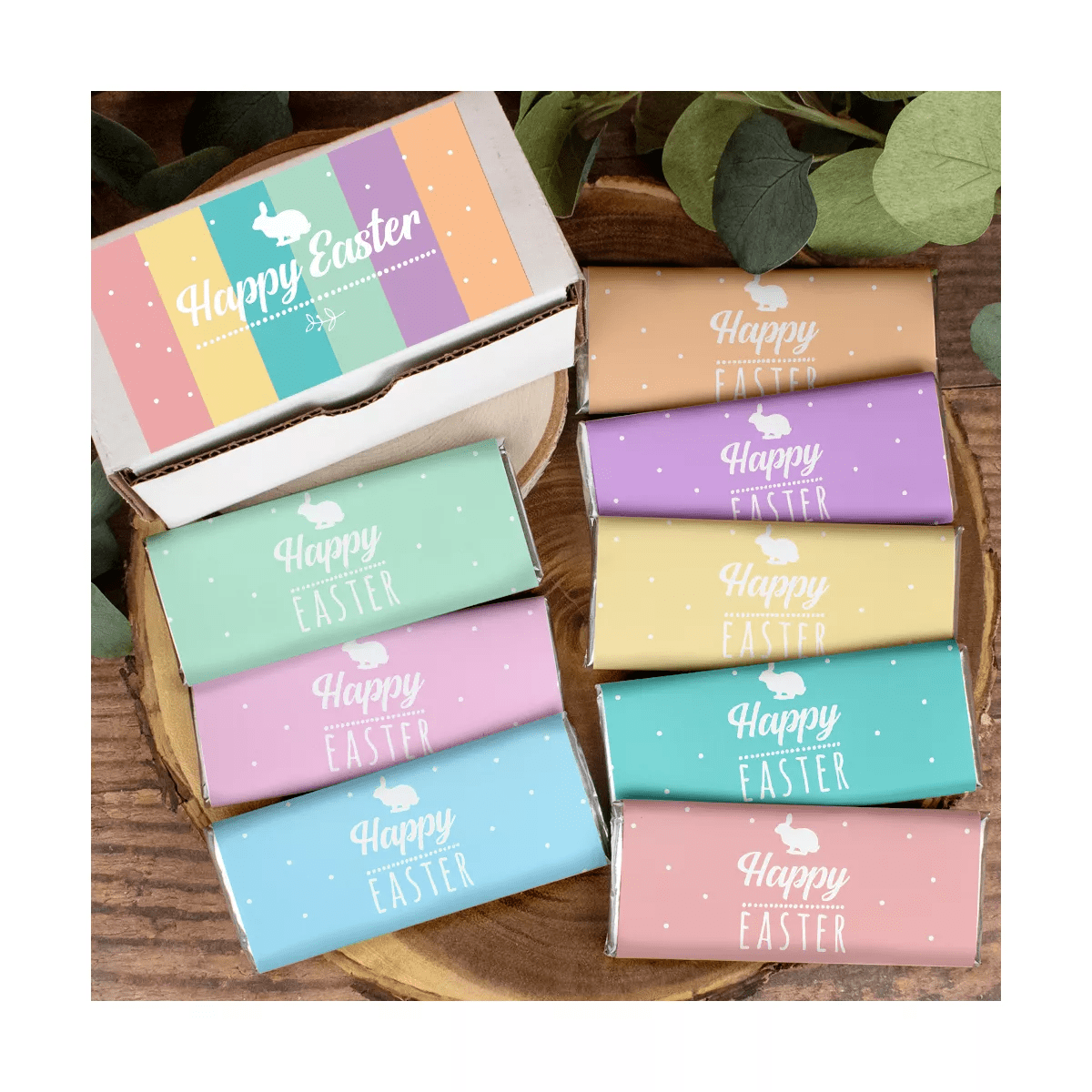 Celebrate Easter by gifting delicious Hershey’s chocolate. This unique gift box includes eight Easter themed Hershey’s Chocolate Bars in a gift box. Each chocolate bar wrapper is a different pastel color (purple, pink, orange, yellow, light blue, teal, green, and red). These delicious chocolate bars make the perfect basket stuffers or gifts for guests at church or the office. Candy Orders ship with free cold pack packaging as needed.