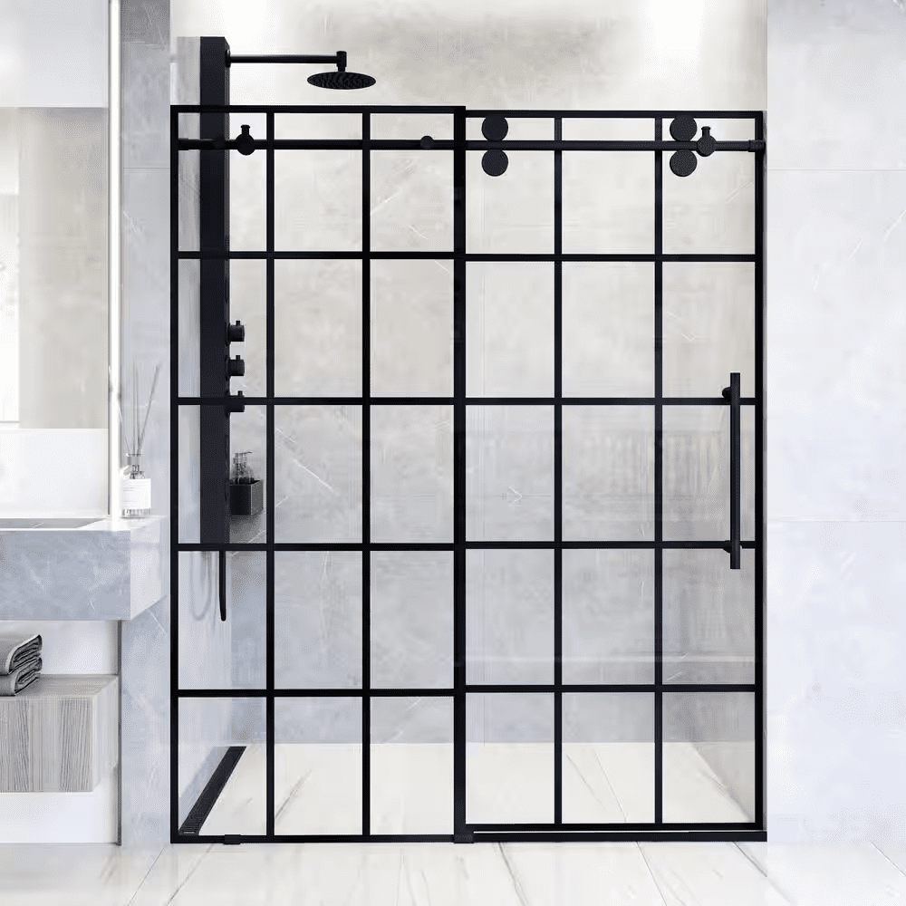 Elan 68 to 72 In. W X 74 In. H Sliding Frameless Shower Door in Matte Black with 3/8 In. (10Mm) Clear Grid Glass
