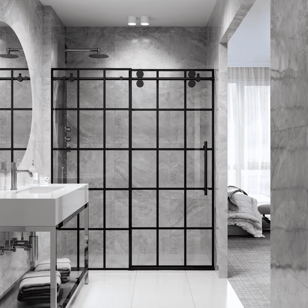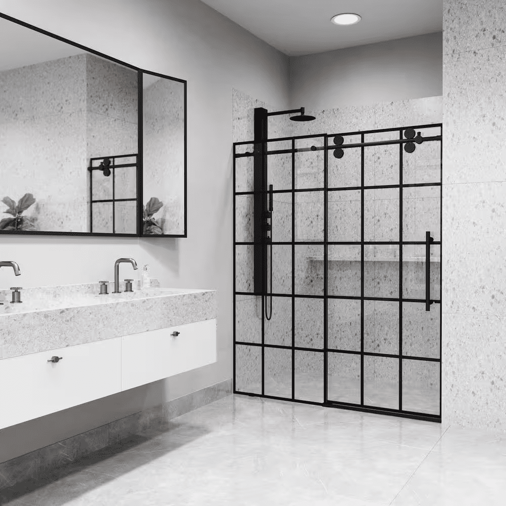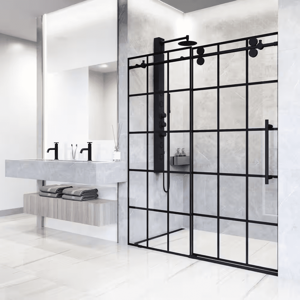 Be the first to review “Elan 68 to 72 In. W X 74 In. H Sliding Frameless Shower Door in Matte Black with 3/8 In. (10Mm) Clear Grid Glass”