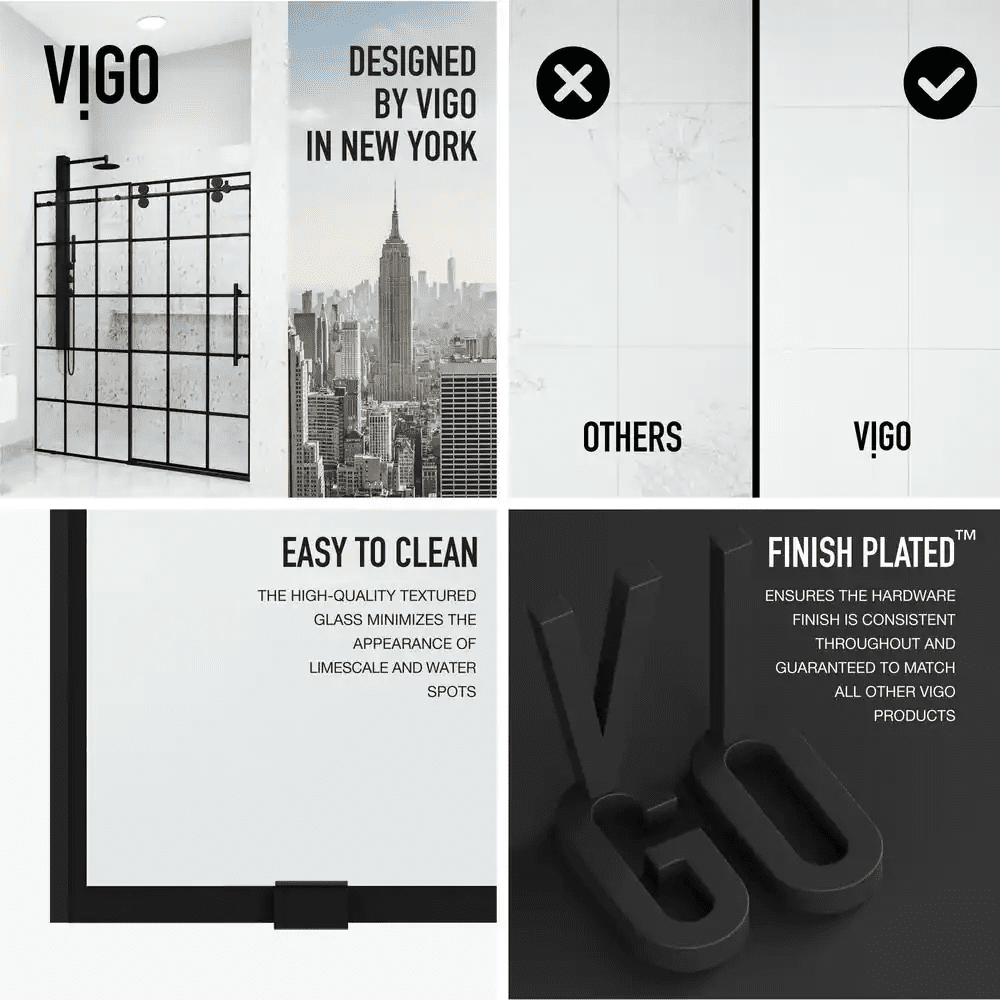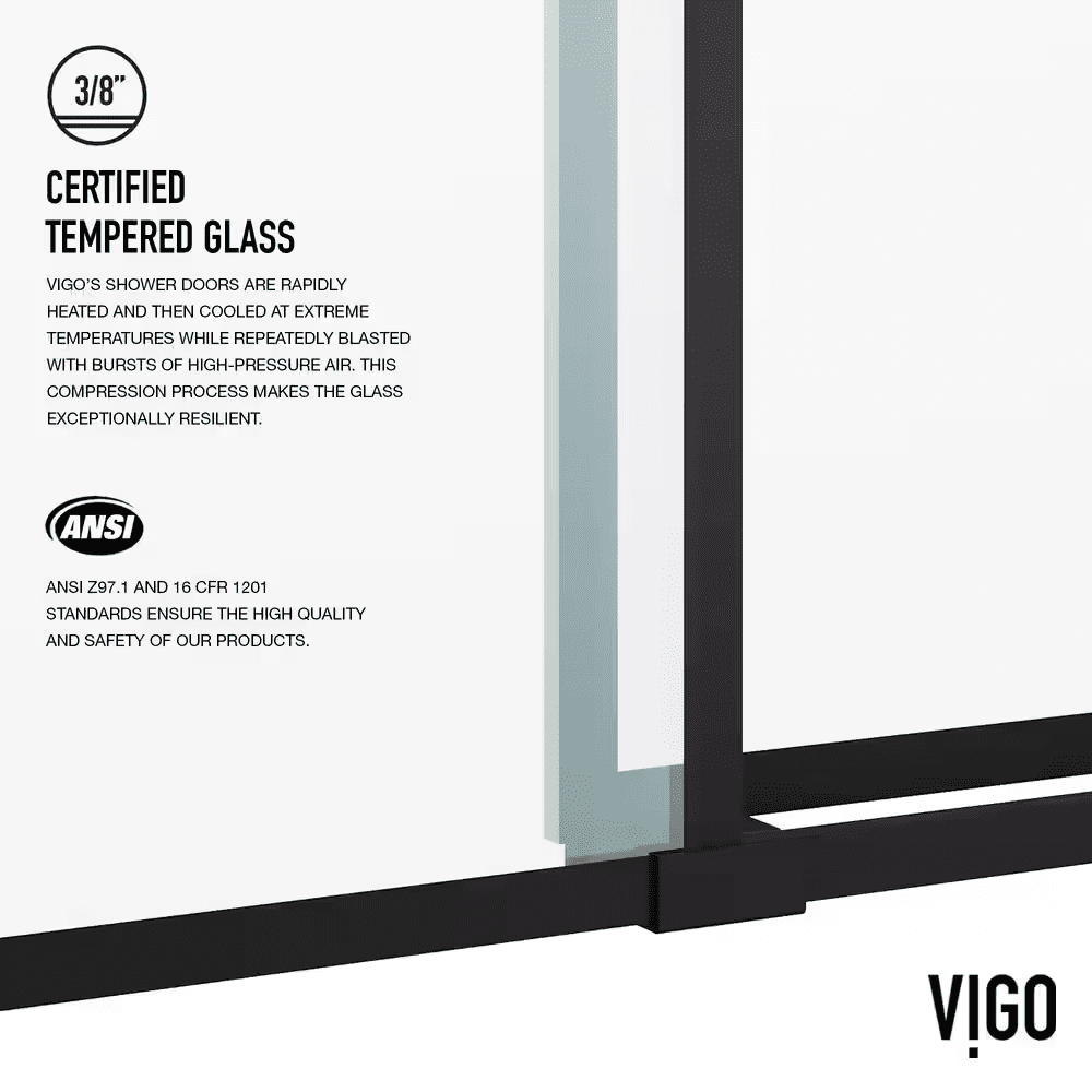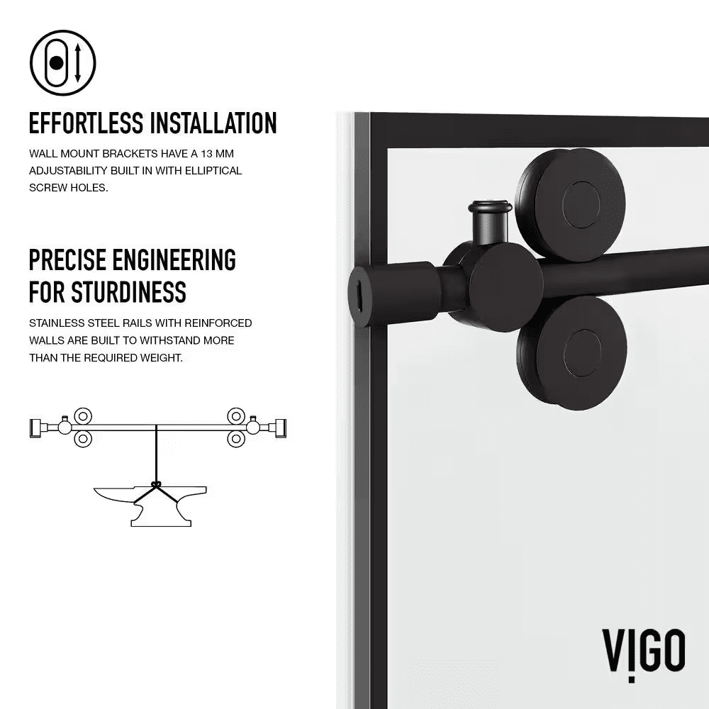 The VIGO Elan Frameless Sliding Shower Door in Matte Black finish combines modern design with exceptional functionality, fitting openings from 68 to 72 inches in width. This sophisticated shower door features a generous 28 to 32-inch walk-in entry, ensuring comfortable access for daily use. The door operates on an advanced sliding system with four-wheel rollers, delivering whisper-quiet, air-like gliding motion for effortless opening and closing. Its reversible design allows for right or left-side installation, providing flexibility to accommodate various bathroom layouts and plumbing configurations. The door showcases clear tempered glass that creates an unobstructed view while allowing natural light to flow throughout the bathroom, making the space appear larger and more open. The frameless design, paired with substantial 3/8-inch thick tempered glass, adds a touch of luxury and creates a sleek, modern aesthetic that enhances any bathroom’s visual appeal. The minimalist design eliminates visual barriers, creating an open, spacious feeling that transforms your shower space. While this door displays elegantly in Matte Black finish, it’s also available in Chrome, Matte Brushed Gold, and Stainless Steel to complement any bathroom decor style.