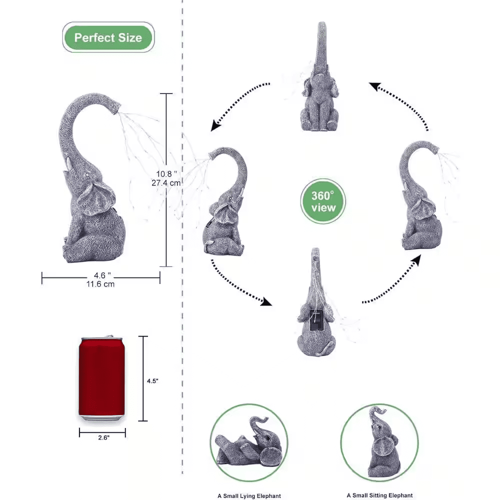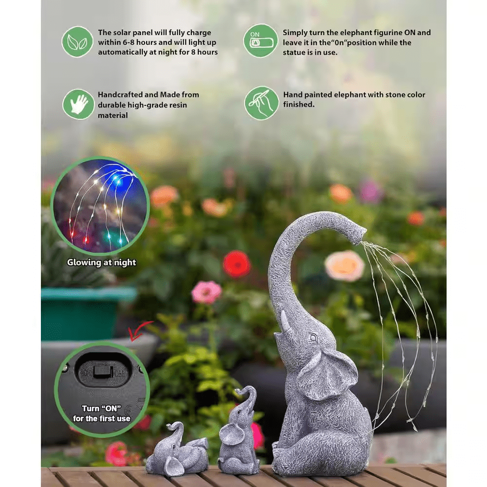 Solar Elephant Garden Statue: Timeless Charm with Warm Nighttime GlowElevate your outdoor space with this solar-powered elephant statue-a blend of timeless elegance and practical charm. More than just a lawn ornament, it’s a versatile decor piece that adds grace to porches, patios, balconies, or front yards by day, and casts a soft, warm glow by night. Whether nestled among garden greenery or placed on a porch corner, its artistic details and gentle presence turn ordinary spots into inviting focal points.Crafted for year-round durability, it’s made from premium resin with hand-painted accents and a UV-resistant coating, boasting an IP44 waterproof rating that stands up to rain, snow, and harsh sunlight without fading or damage. Using it is effortless: turn it on once during the day, and its solar panel charges under sunlight, then automatically lights up at dusk-providing hours of warm illumination with no complicated setup or wiring.It’s also a thoughtful gift for every occasion. From birthdays and Christmas to Mother’s Day, Father’s Day, or weddings, this elephant statue delights animal lovers, family, and friends alike-turning their homes or gardens into more charming, personalized spaces.