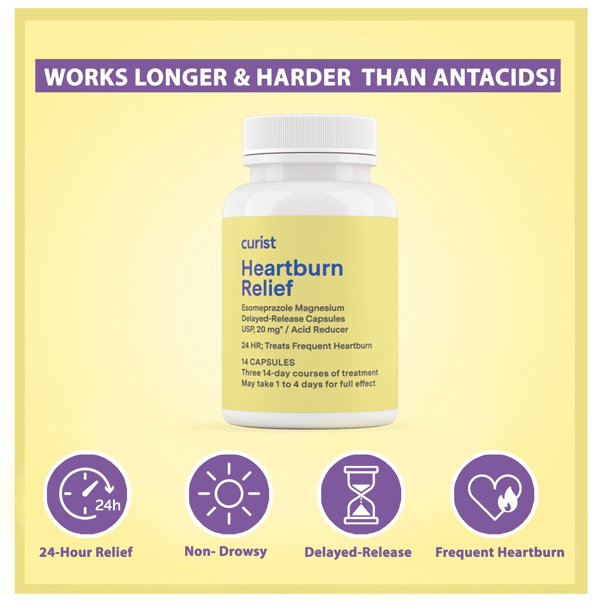 - GREAT ADDITION TO YOUR MEDICINE CABINET: Be prepared for acid reflux and heartburn by stocking Curist Heartburn Relief Esomeprazole to your medicine cabinet. No one wants to run to the pharmacy when heartburn strikes.