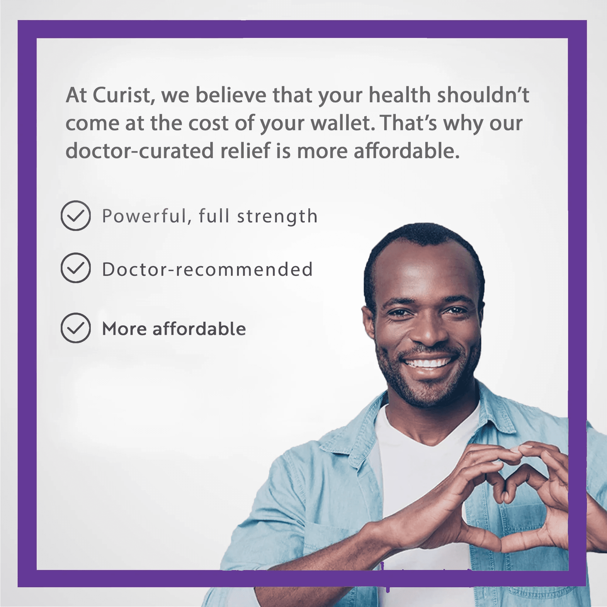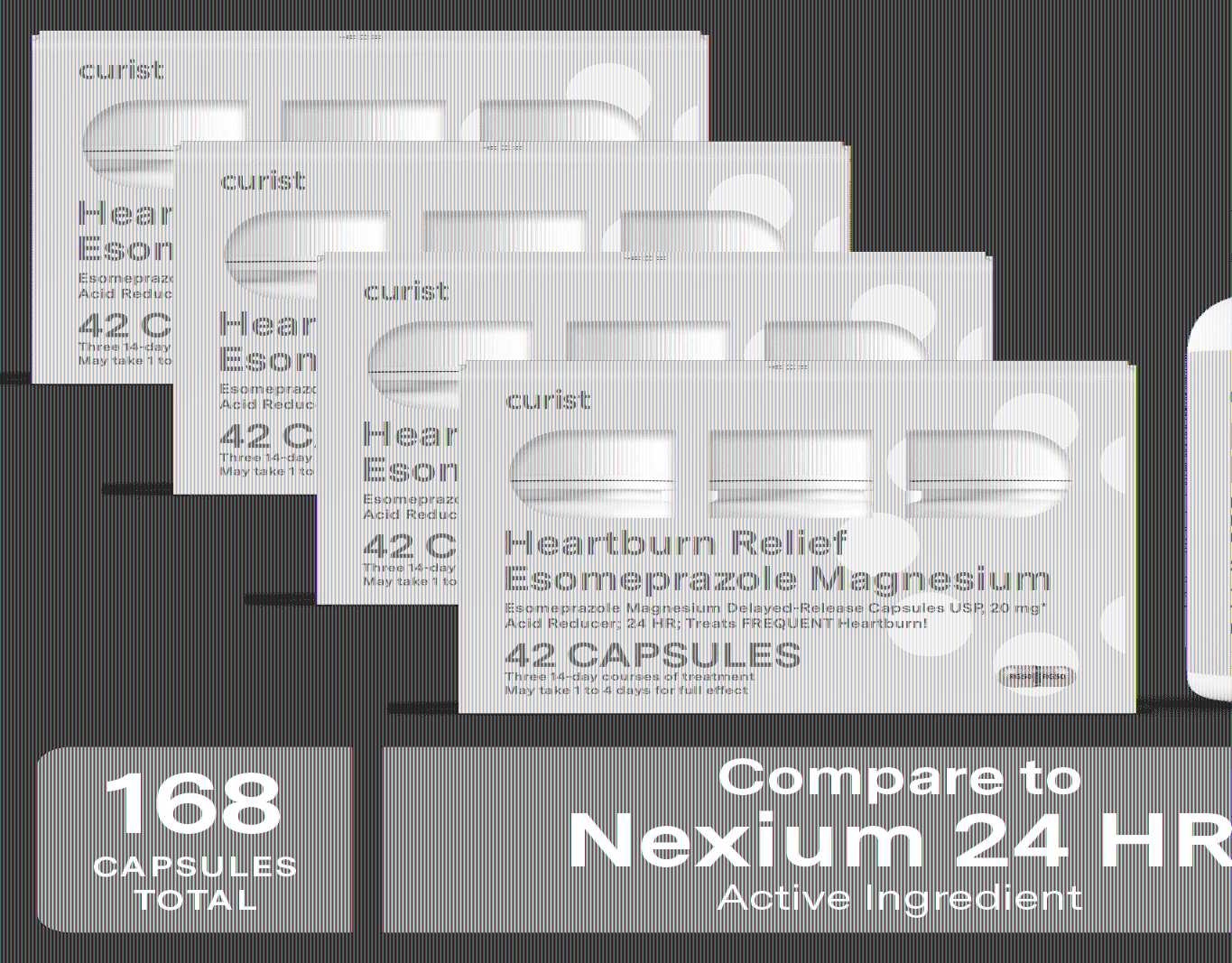 Stop suffering from acid reflux and eat your favorite meals by taking Curist Heartburn Relief (esomeprazole 20 mg delayed-release capsules). Curist Heartburn Relief treats frequent heartburn that is often caused by eating acidic, fatty, or spicy foods, or drinking caffeine. The prescription-strength, non-drowsy esomeprazole medicine blocks the production of acid in the stomach and works for 24 hours with just one pill. Curist Heartburn medicine works for more time than antacids and stops more acid over time than H-2 blockers. With the same active medicinal ingredient as Nexium, Curist Heartburn medicine provides the same clinical strength as Nexium. Each capsule contains esomeprazole 20mg (equivalent to esomeprazole magnesium trihydrate 22.3 mg), the same active ingredient as in Nexium. This listing contains 168 capsules total (4-pack of 42ct each) – buy in bulk and save! Curist Heartburn Relief is suitable for adults 18 years and up.