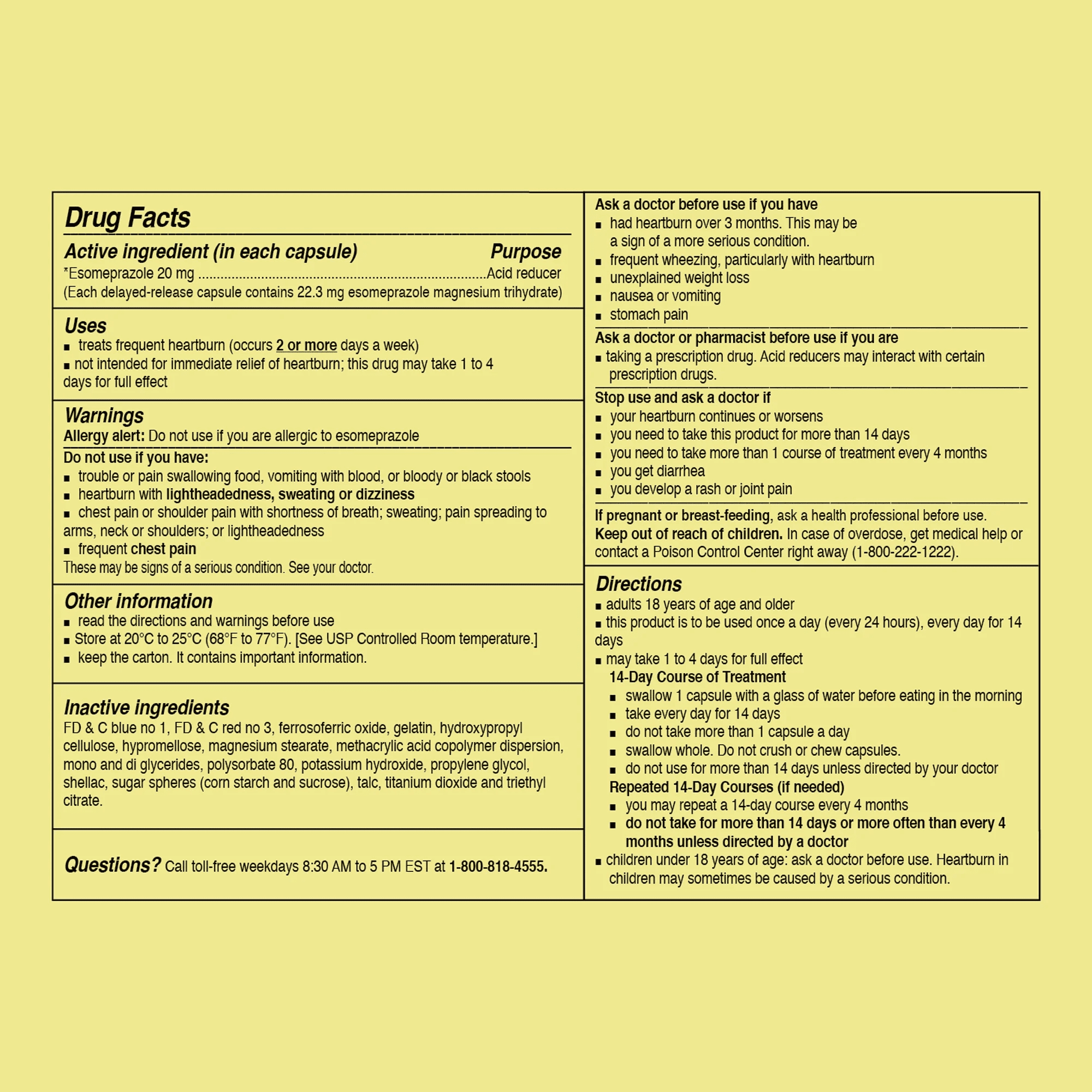 - Long-Lasting Heartburn Relief: Relieve heartburn and acid reflux pains with esomeprazole 20 mg delayed-release capsules. 24-hour relief by stopping acid production at the source.