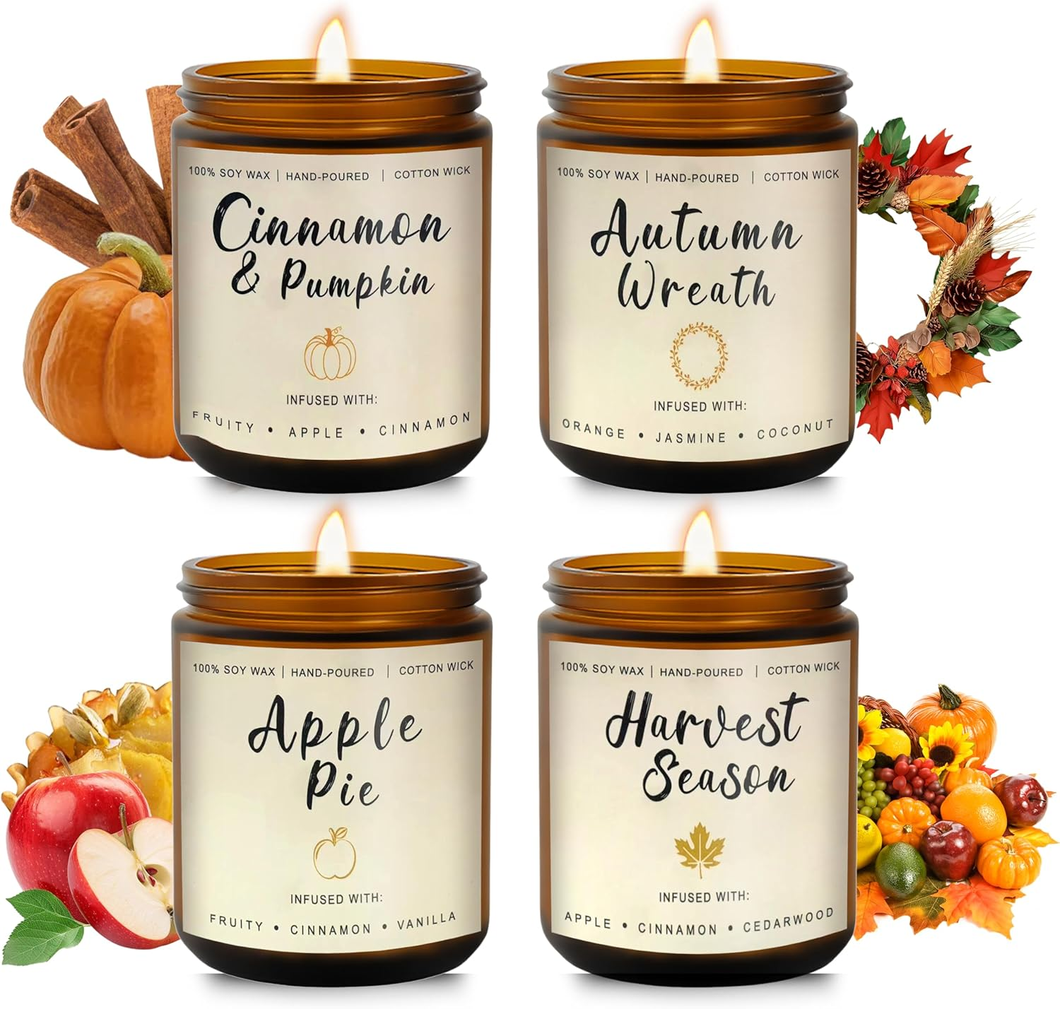 - 🎃 Perfect Fall Candles Gift Set: Celebrate the cozy season with this 4-pack scented candle set, including Pumpkin Spice, Apple Pie, Cinnamon, and Harvest scents. A thoughtful autumn candle gift for women, moms, teachers, or anyone who loves fall!