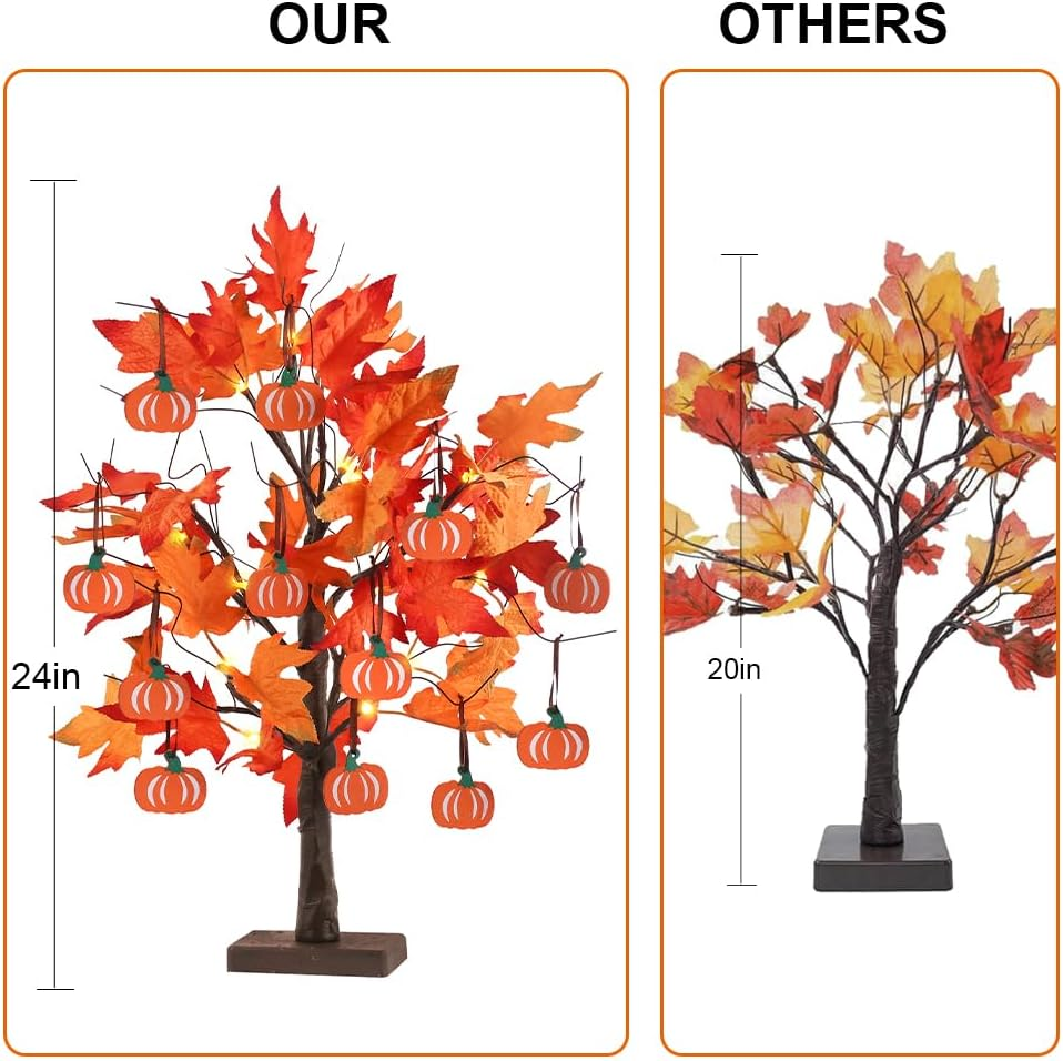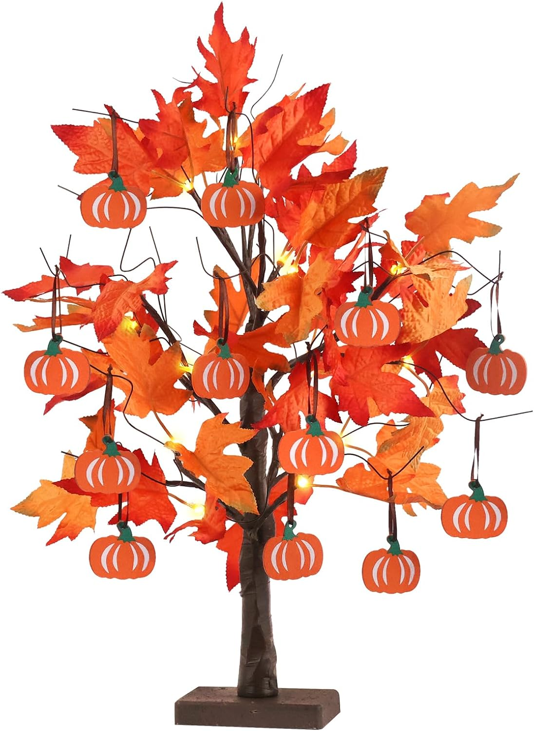 - 🍁【Fall Decorations for Home】 With 12 orange wooden pumpkin ornaments, brown trunk, 24 pairs of maple leaves, flexible branches and 24 LED soft warm lights, fall tree decorations are essential home decorations for Autumn. Every artificial tree is in The bendable branches look gorgeous with a warm white glow, and the classic pumpkin-colored ornament showcases a bountiful fall harvest, creating a charming focal point on your table or mantel.