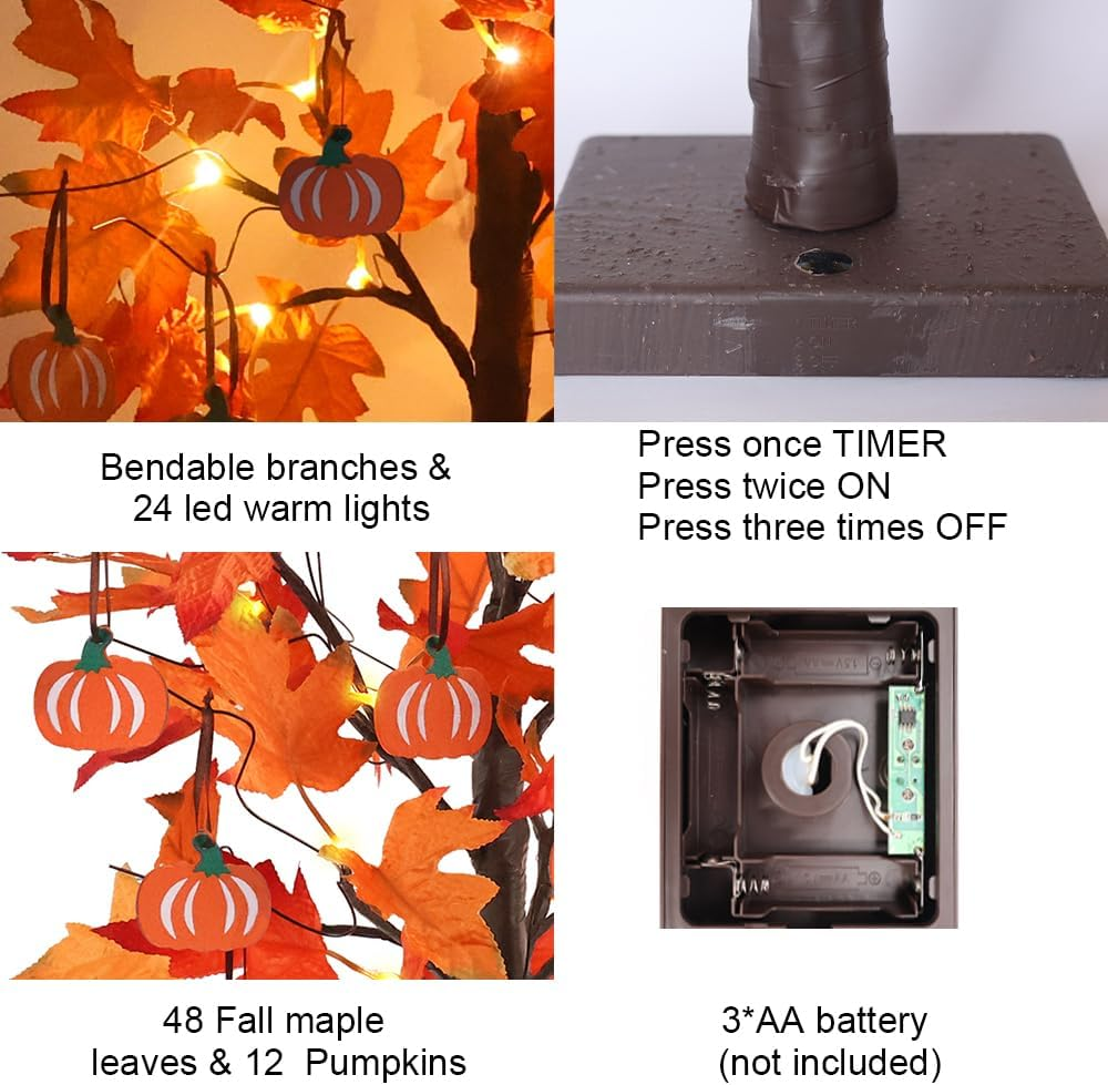 - 🍁【Special Timer Function】 This 24” 2FT fall maple leaves tree dotted with 24 warm white LED create a soft and magical glow. This LED tree is 3 AA batteries (NOT INCLUDED) powered with timer mode which saves you the hassle of manually turning on and off the light. It will turn your birch tree with light off automatically after 6H of use, and powers back on 18H later.