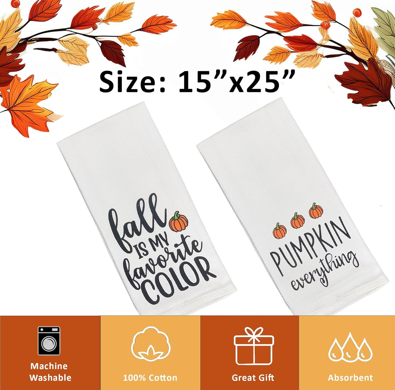 - SIZE: Fall towels measure 15” x 25”. Perfect for kitchen or bathroom during the Halloween and fall season. Hang it on your stove handle or set by the kitchen sink as fall hand towels. Use these autumn dish towels at home, farm, cabin, ranch, lodge. Sturdy enough for busy families or airbnb rentals.