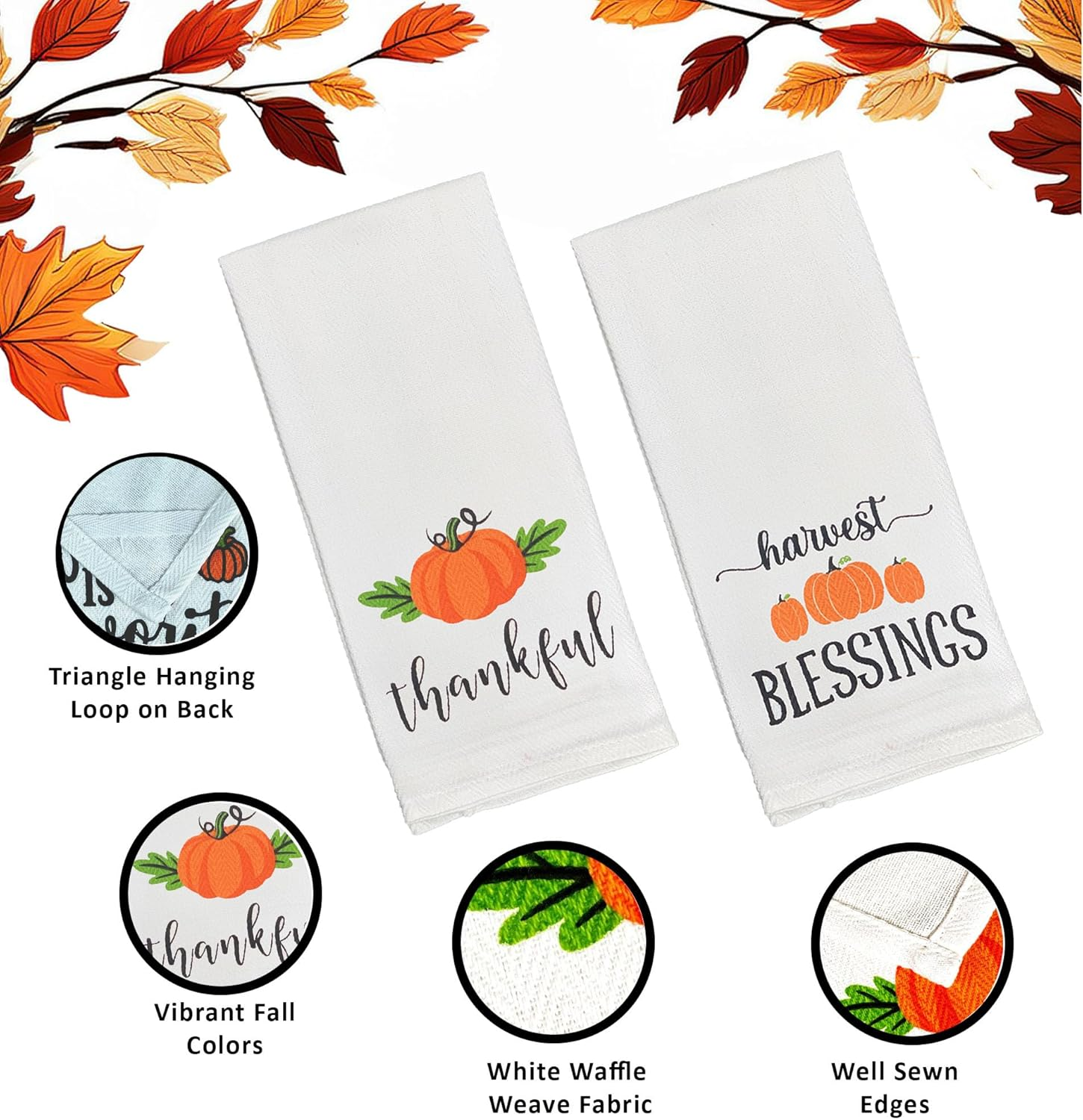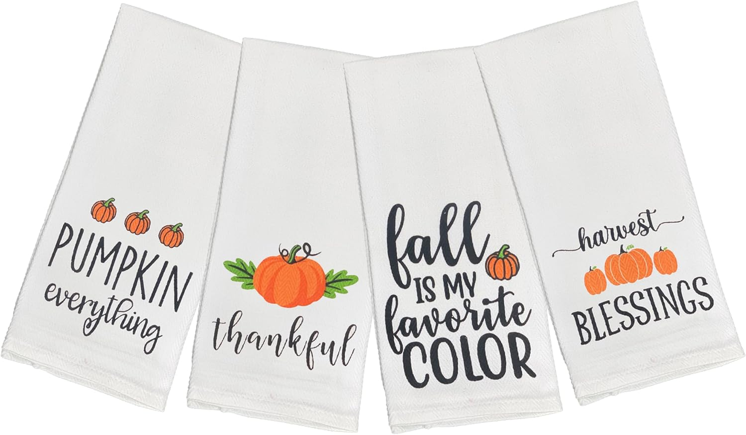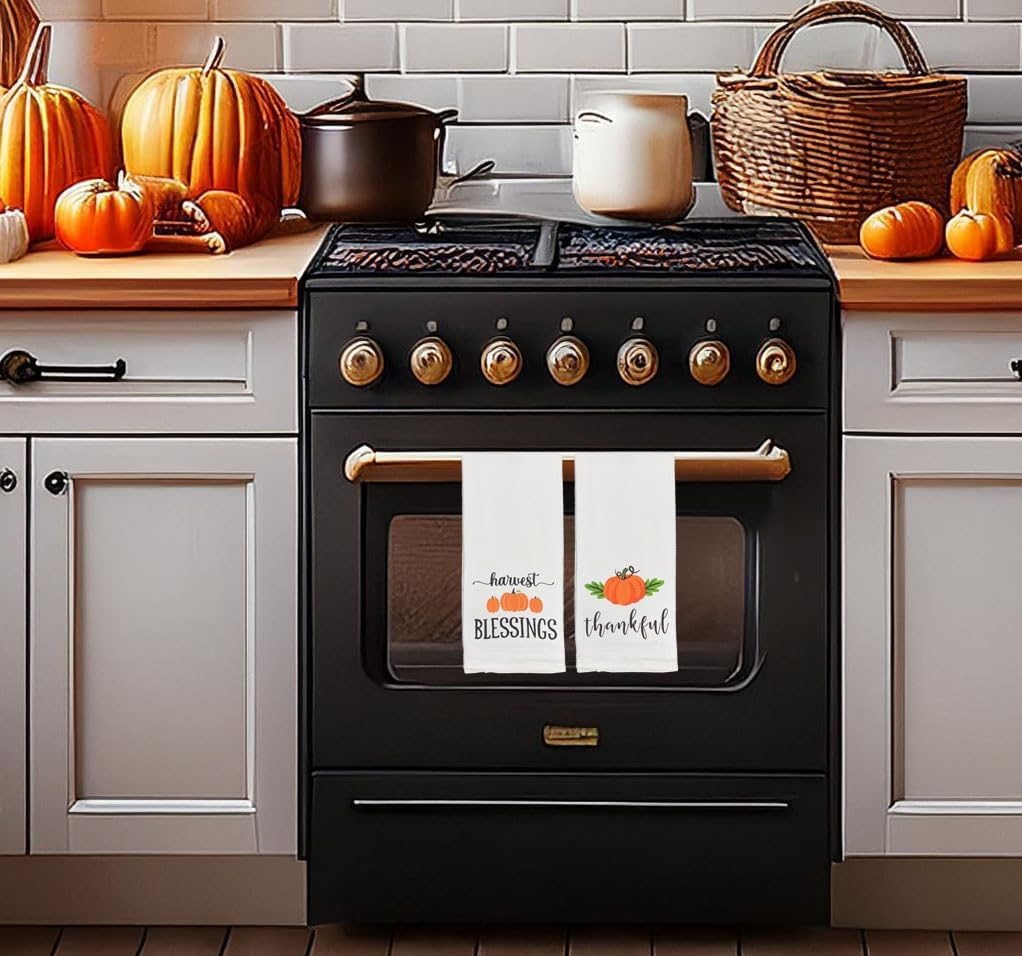 Bring some cheer to your fall decorating with trendy harvest kitchen towels set. Includes of 4 decorative fall tea towels themed thankful, blessed, fall colors and pumpkins.