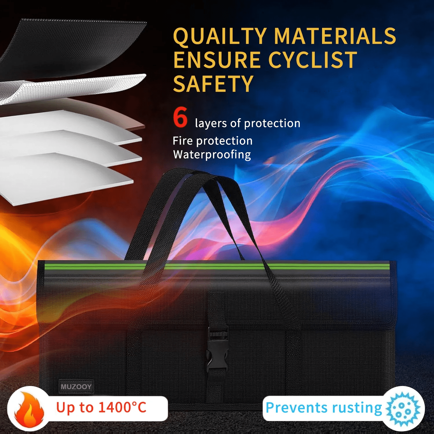 - Fireproof with temperature resistance up to 1800°F, explosion-proof with a three-layer composite material, and waterproof with a silicone coating
