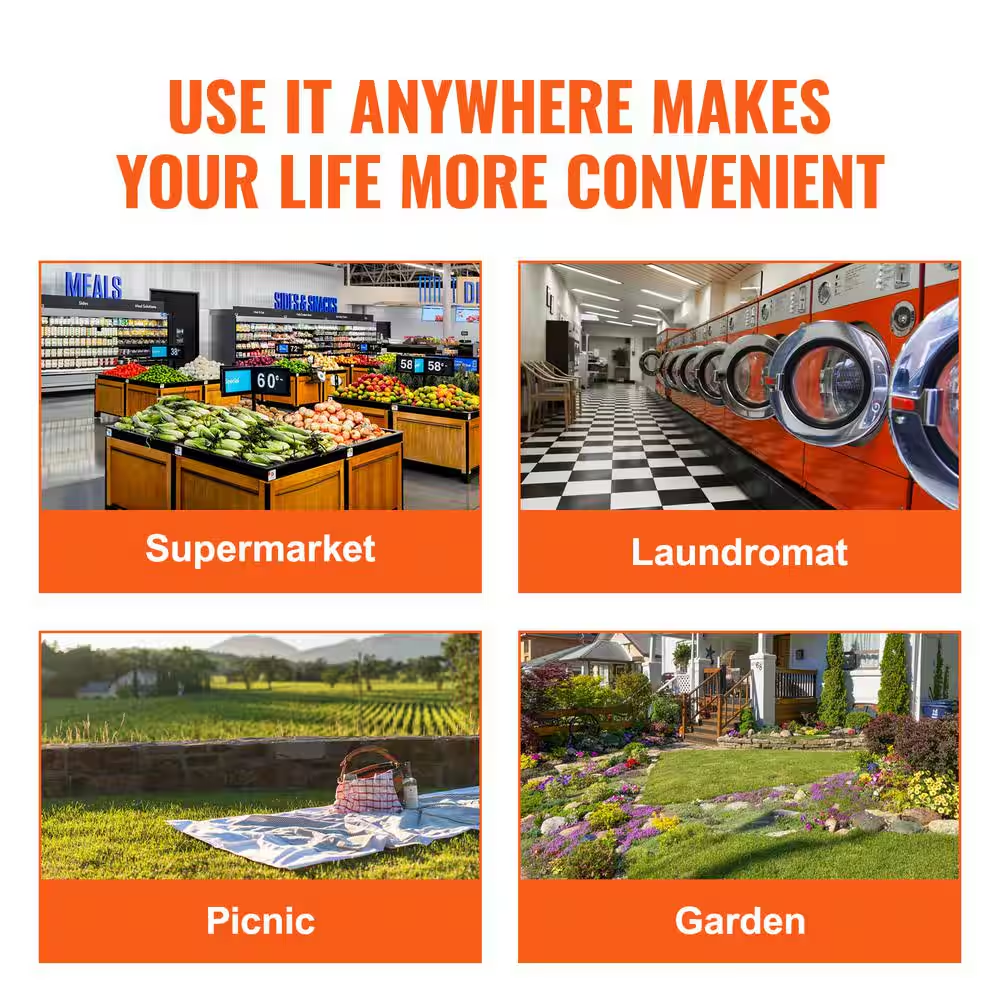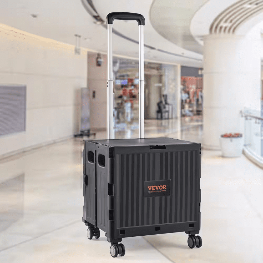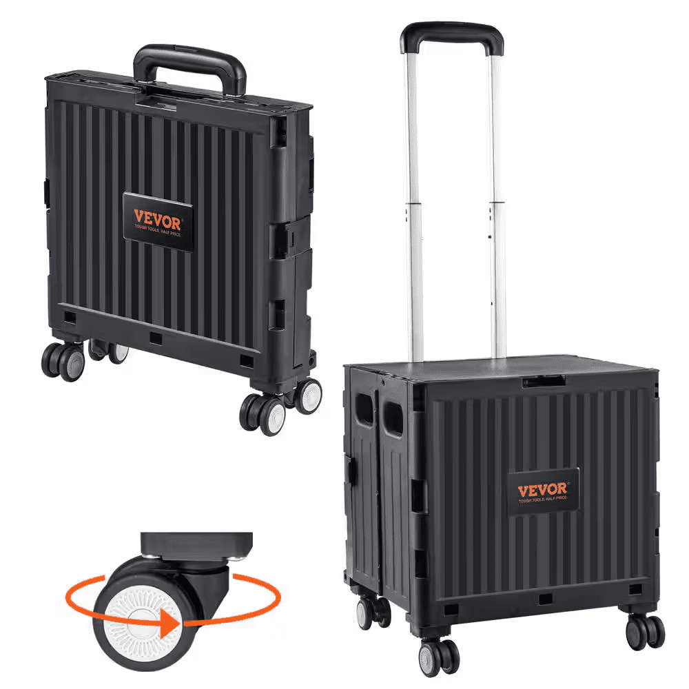 VEVOR Foldable Utility Cart. Whether you’re shopping or globetrotting, this folding shopping cart folds up in a jiffy. With 360° spinning wheels and robust weight capacity, this is the only cart you’ll ever need.