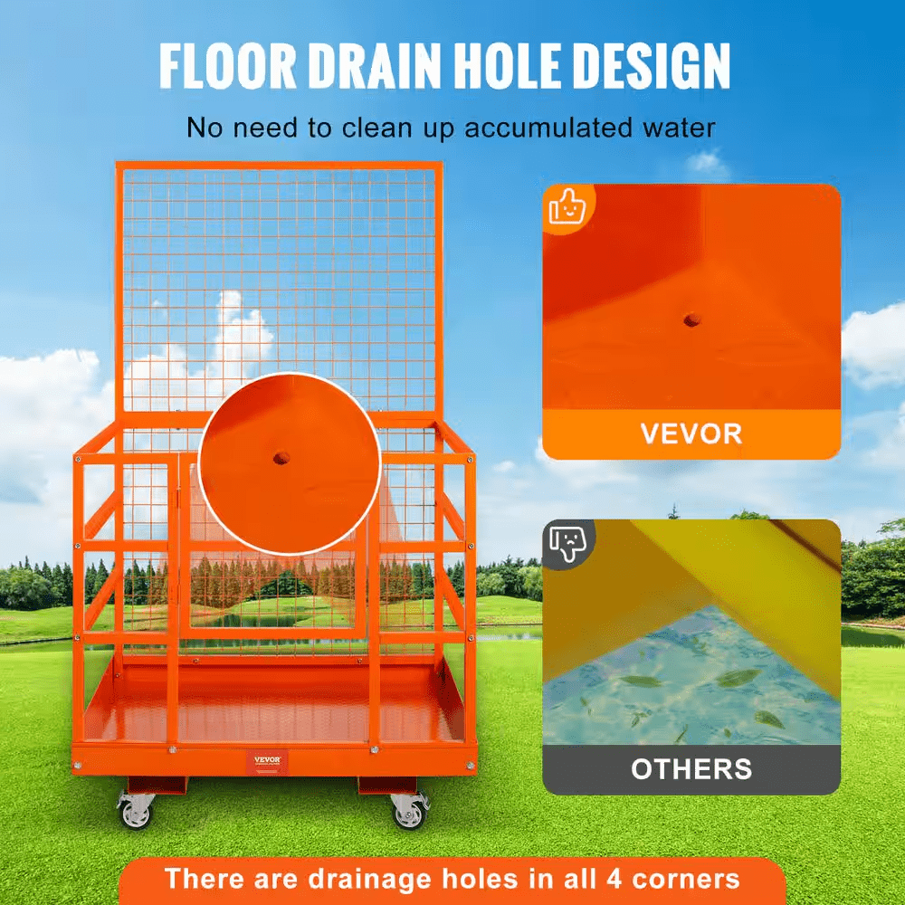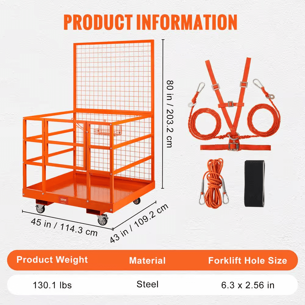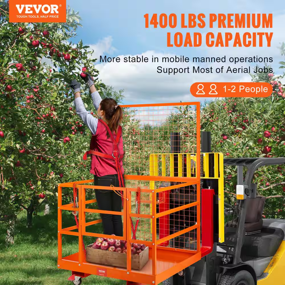VEVOR Forklift Work Platform. VEVOR forklift safety cage can bear 1400 lbs. and carry 1-2 people simultaneously. It is suitable for any standard forklift or pallet loader and is the best helper for aerial work.