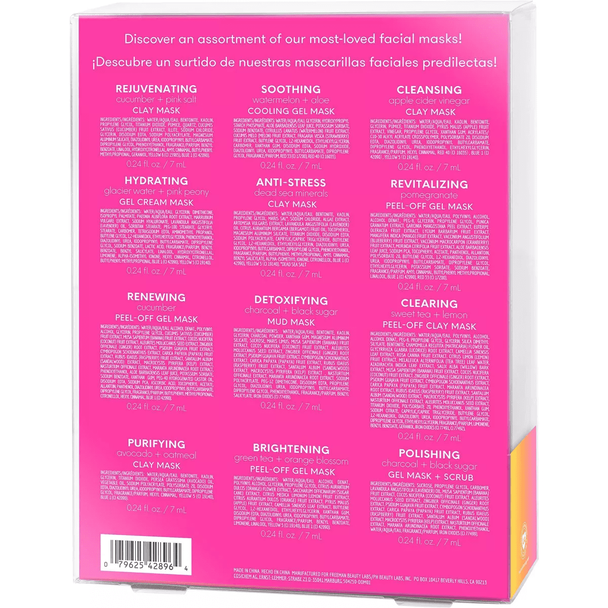- Freeman Love to Mask Facial Mask Kit Includes: (1) Rejuventating Cucumber & Pink Salt Clay Mask, (1) Soothing Watermelon & Aloe Cooling Gel Mask, (1) Cleansing Apple Cider Vinegar Clay Mask, (1) Hydrating Glacier Water & Pink Peony Gel Cream Mask, (1) Anti-Stress Dead Sea Minerals Clay Mask, (1) Revitalizing Pomegranate Peel-Off Gel Mask, (1) Renewing Cucumber Peel-Off Gel Mask, (1) Detoxifying Charcoal & Black Sugar Mud Mas, (1) Clearing Sweet Tea & Lemon Peel-Off Clay Mask, (1) Purifying Avocado & Oatmeal Clay Mask, (1) Brightening Green Tea & Orange Blossom Peel-Off Gel Mask, (1) Polishing Charcoal & Black Sugar Gel Mask & Scrub, (1) Silicone Face Buffer, and (1) headband