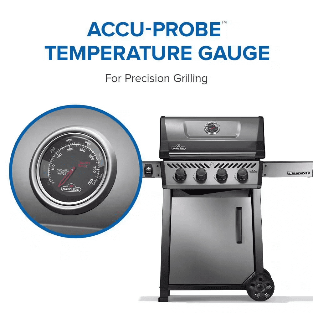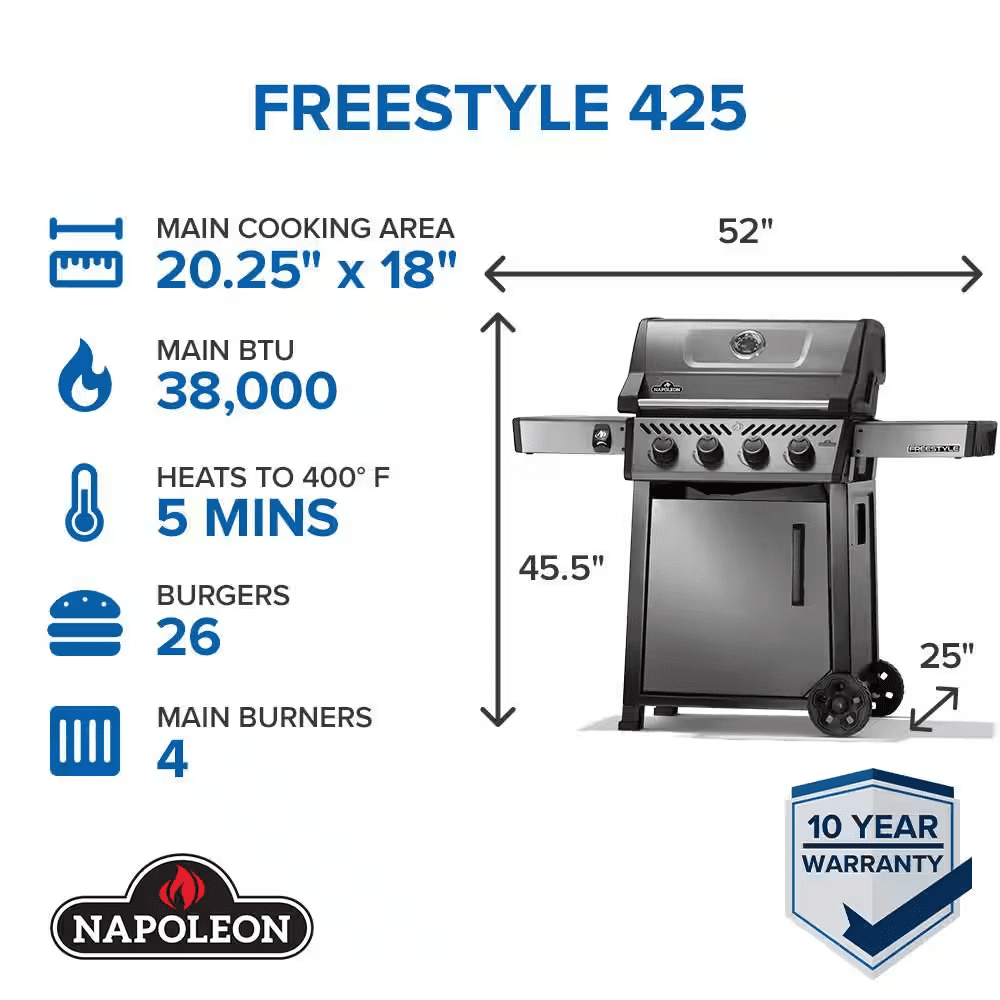 Step up your grilling game with the Napoleon Freestyle 425, the perfect balance of premium features and compact design. A bit larger than the 365, the Freestyle 425 offers extra cooking space for your larger gatherings without overwhelming your backyard. It’s big enough to feed the crowd, yet still streamlined enough to fit neatly into smaller spaces. Napoleon is always delivering more – more cooking space, more features, and more value, without the premium price tag. With the Freestyle 425, you get the flexibility to cook for any occasion, all while enjoying the same expert craftsmanship and innovation Napoleon is known for. At Napoleon no detail is too small. EVERY. DETAIL. MATTERS.