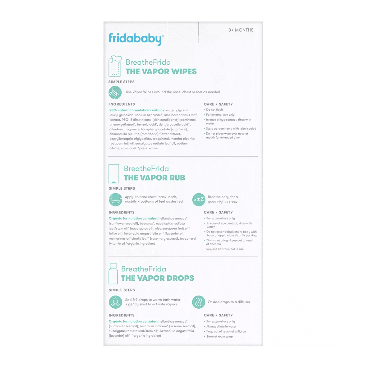 - VAPOR DROPS: BreatheFrida the Vapor Drops can be added to bath water or diffuser as an organic essential oil for sick day comfort.