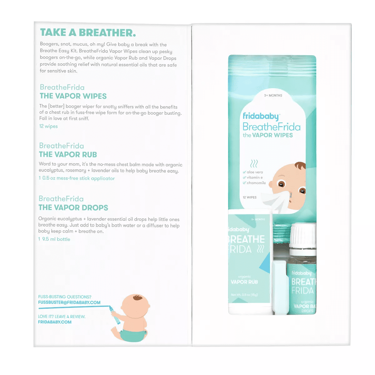 Take a breather. Boogers, snot, mucus, Oh my! Give baby a break with the breathe easy kit. Breathe Frida vapor wipes clean up pesky boogers on-the-go, while organic vapor rub and vapor drops provide soothing relief with natural essential oils that are safe for sensitive skin.