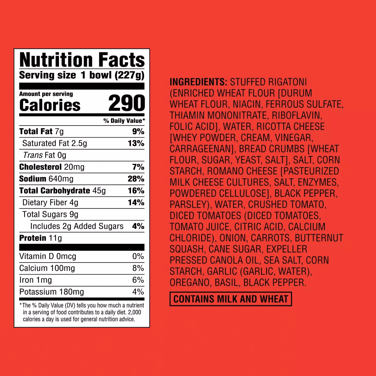 Give them a tasty pasta dish they’ll love and some hidden vegetables** too with this delicious frozen Stuffed Mini Rigatoni in a Marinara Sauce from Good & Gather™. Featuring tasty mini rigatoni pasta stuffed ricotta and Romano cheeses, this meal is made with a marinara sauce that includes tomato, onion, carrot, butternut squash and garlic to add up to 1/2 cup of vegetables per serving.** The stuffed pasta is sealed on the ends for a cheesy taste and chewy texture they’re sure to love, and it’s ready in just minutes in your microwave for a delicious, easy dish that you can quickly serve up even on the busiest days.