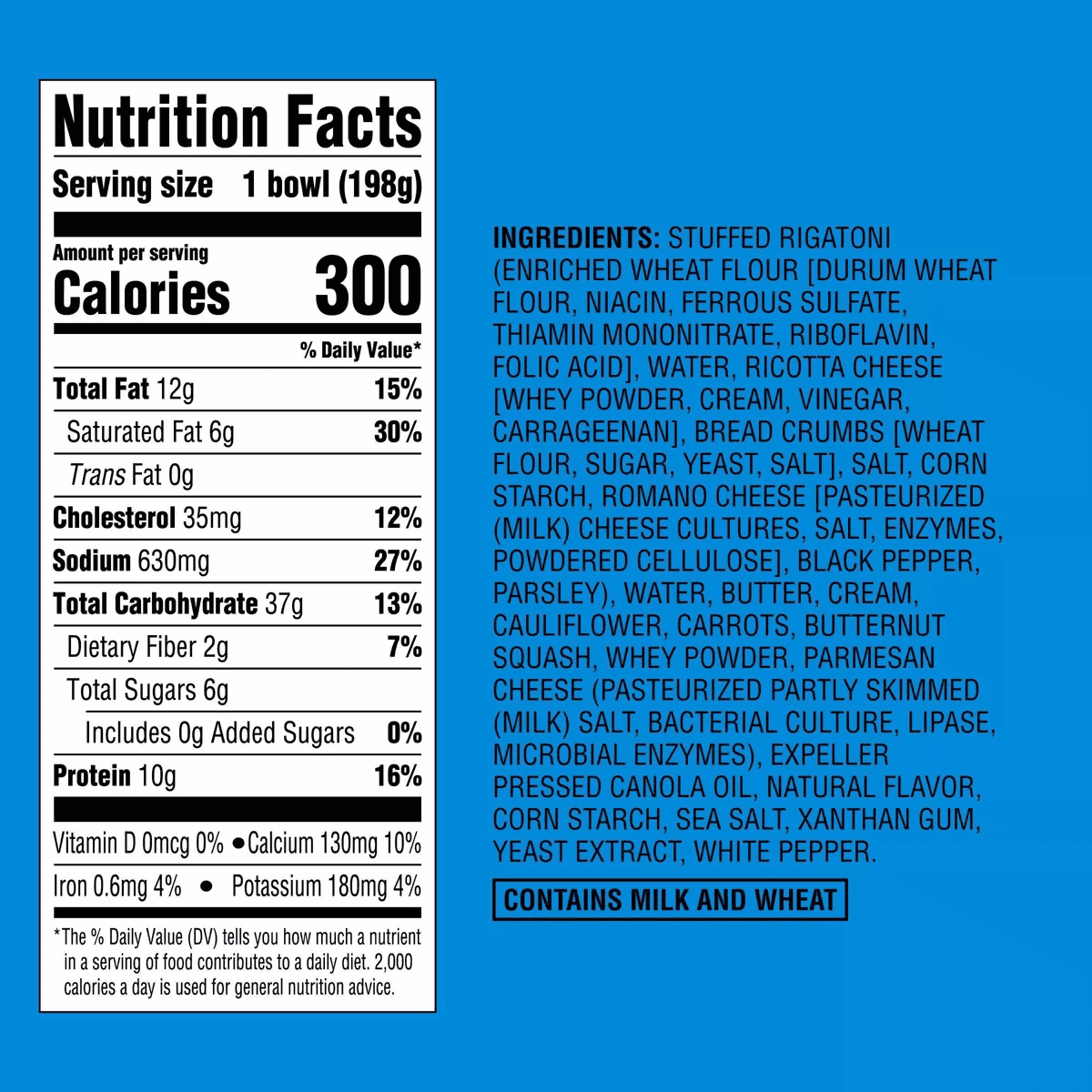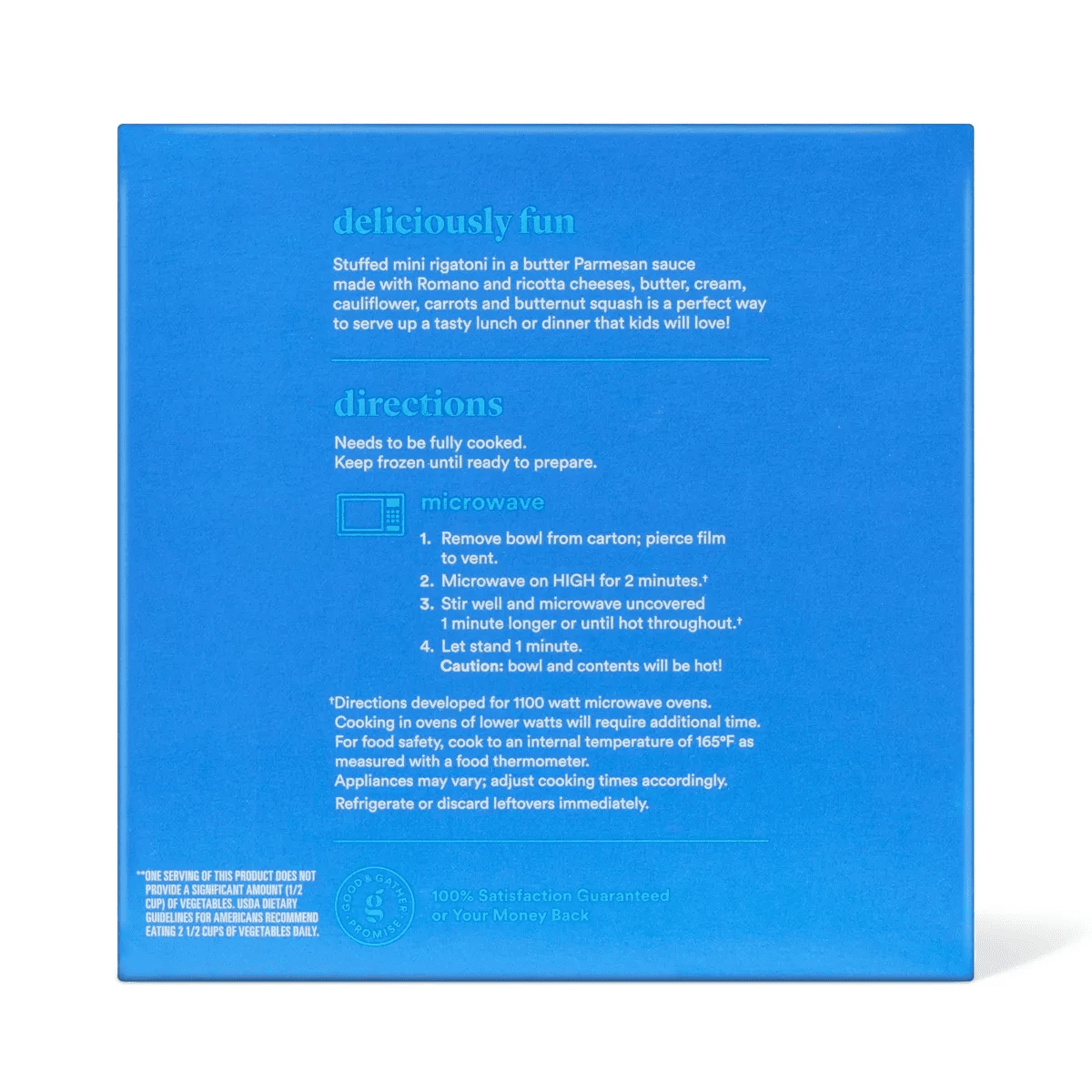 This Frozen Stuffed Mini Rigatoni with Butter Parmesan Sauce from Good & Gather™ is the perfect quick meal for hungry kids and families on the go. Made with ricotta and Romano cheeses, butter, cream, cauliflower , carrot and butternut squash. They feature 10 grams of protein per serving*, no artificial preservatives or flavors. Plus, the vegetables are hidden in the sauce for optimal flavor. Simply microwave until fully cooked.