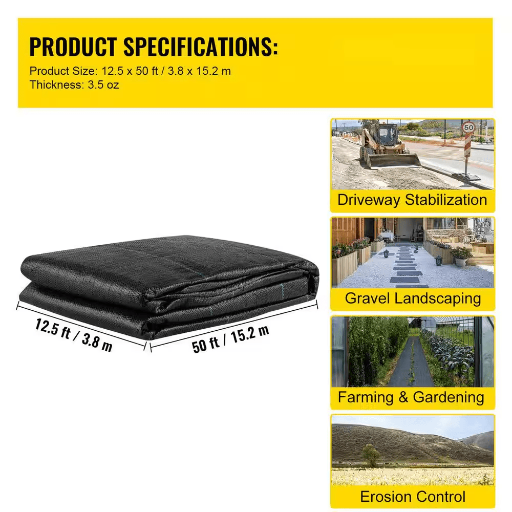 12.5 x 50 ft. Geotextile Driveway Fabric Durable and High-Performance . The 3.5oz. geotextile fabric is made of robust PP, tear and corrosion resistant, with a tensile strength of 600 lbs. It has excellent permeability and a fast water flow rate, making it ideal for driveway stabilization, landscaping, weed and erosion control, french drain, and planting. Large-Sized Geotextile Fabric, Robust Woven PP Substance, 600 lbs. Tensile Capacity, Superb Water Permeability.