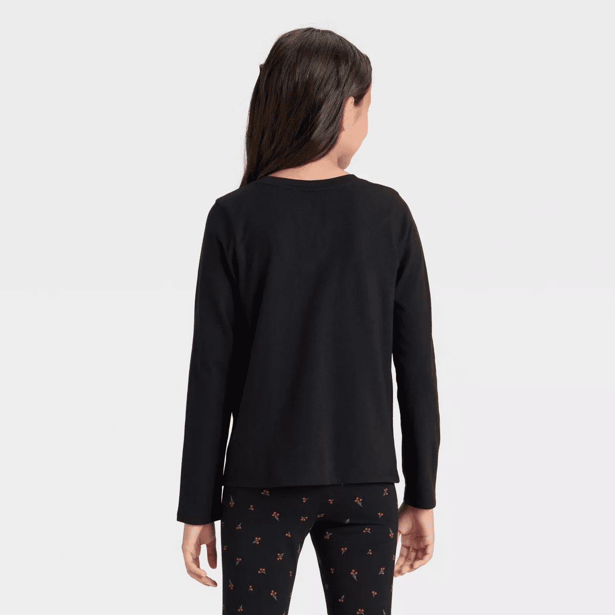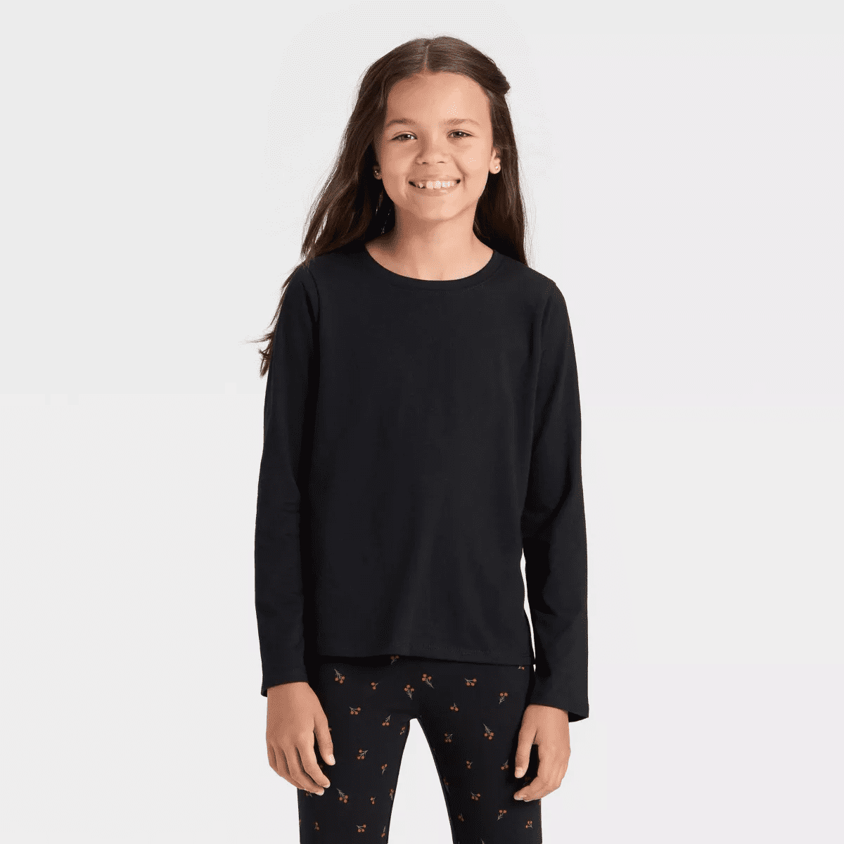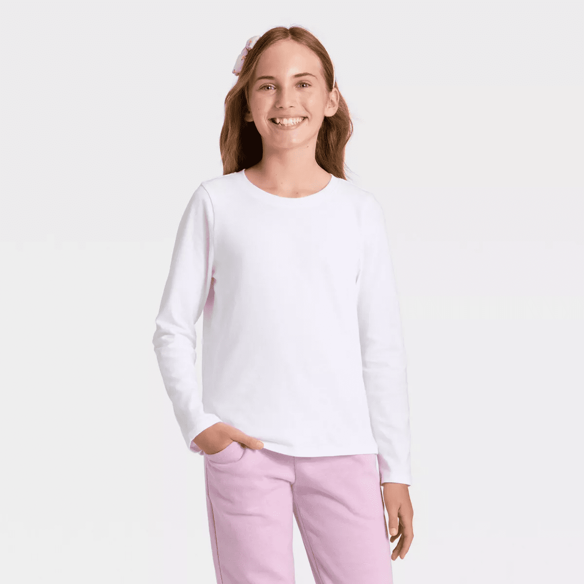 Update your child’s everyday wardrobe with this Long-Sleeve T-Shirt from Cat & Jack™. Made from cotton-recycled polyester blend jersey fabric and featuring a tagless design, this long-sleeve T-shirt helps keep them comfy all day. Falling below the waist, this crewneck tee is designed in a solid hue for easy pairing with their favorite pants, skirts or shorts.