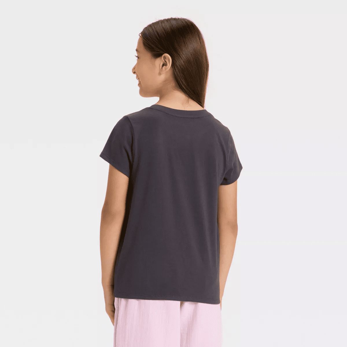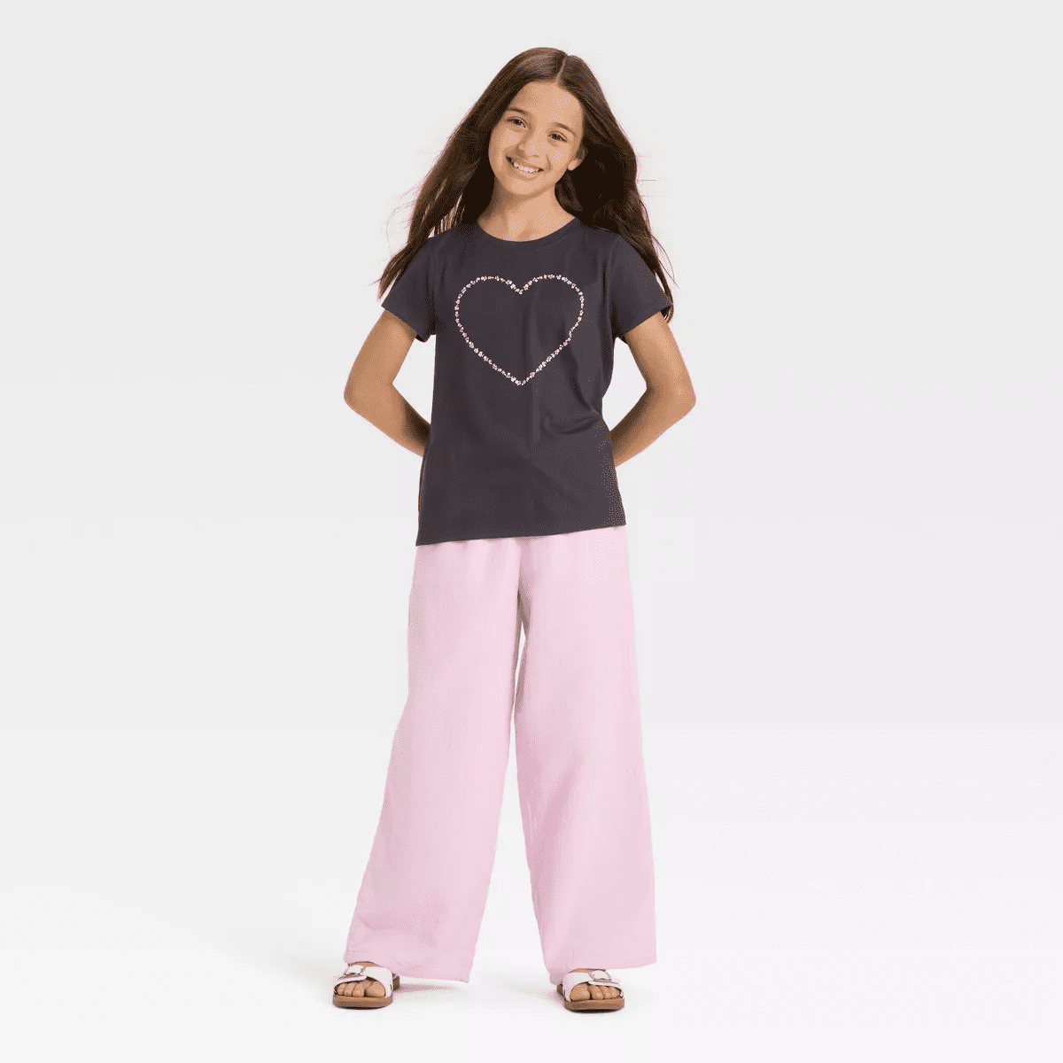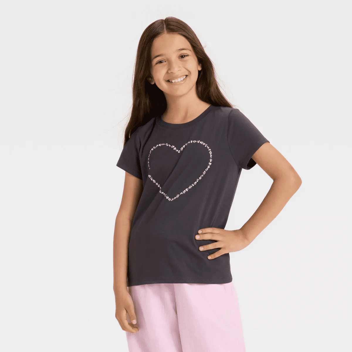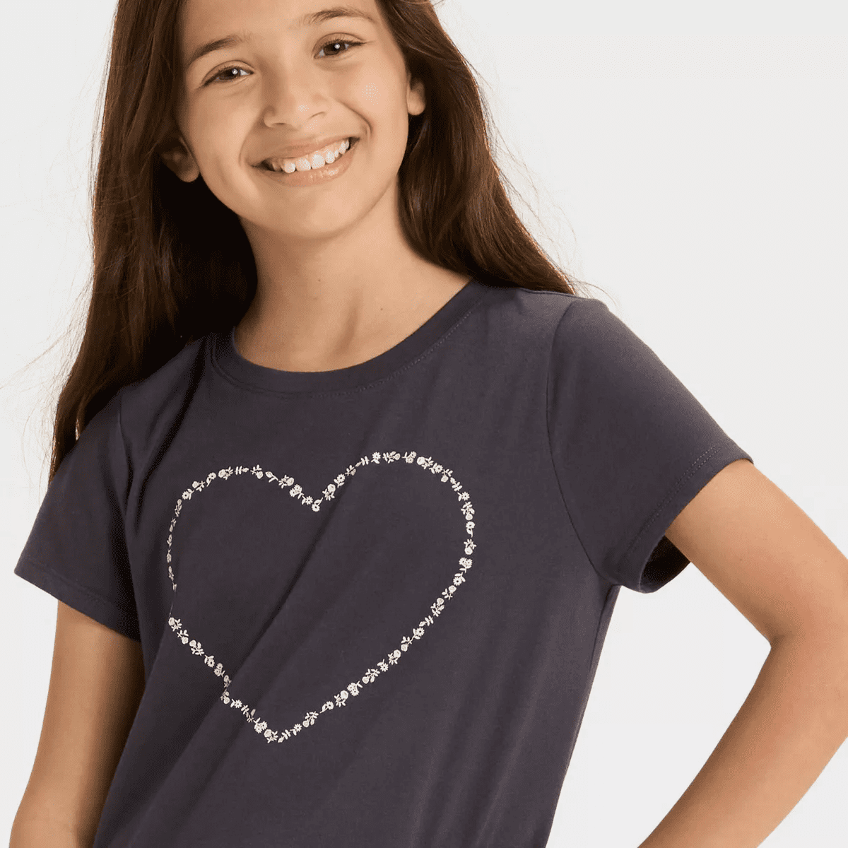 Your child will love the simple, sweet style this Short-Sleeve Heart Graphic T-Shirt from Cat & Jack™ brings to their day. Made from cotton-recycled polyester blend jersey fabric, this short-sleeve T-shirt brings cool comfort while the below-hip length allows them to wear it tucked in or untucked. This crewneck tee is designed in a solid hue, featuring a graphic showing small white flowers in the shape of a heart on the front for an elegant style.
