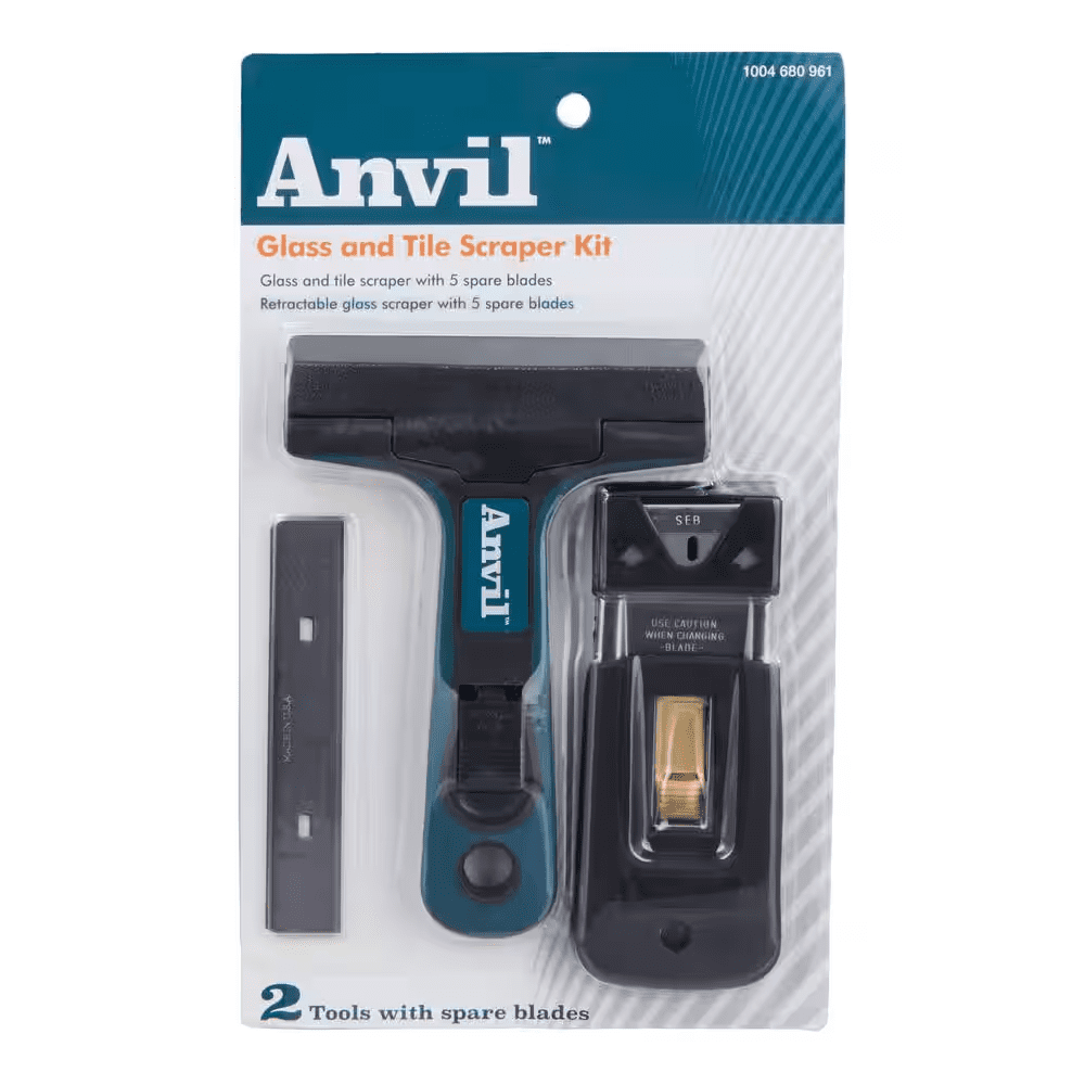 Glass scraper combo kit includes 2-patented scrapers, both with a soft grip handle and replacement blades. Both scrapers feature a quick-change button, so no tools are required to change the blades. The 5 replacement 4 in. universal stripper blades also fit wall strippers. Also included are 5 single-edge razor blades. All blades have sharp, ground edges and should be handled with care.