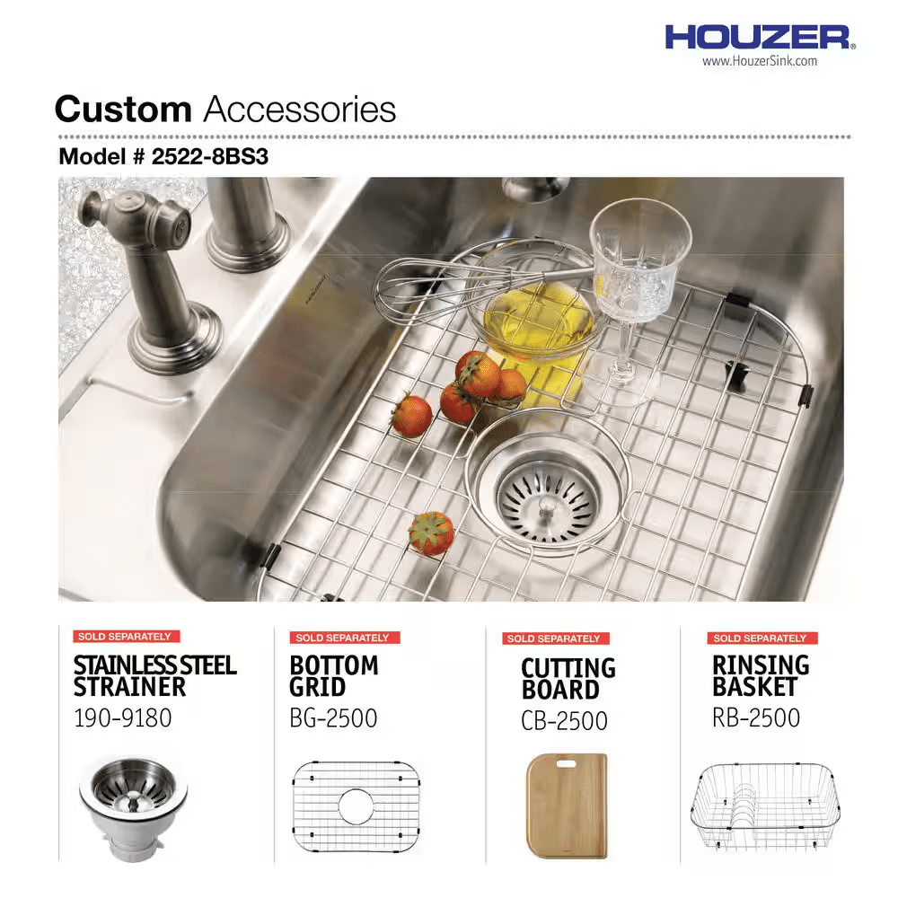 Houzer 2522-8BS3-1 Glowtone Series top mount single bowl kitchen sink features a lustrous satin finish that protects against water, food, and chemical corrosion and complements your home decor. This sink is made of 20-gauge stainless steel and includes a mounting clip. Comes with a lifetime limited warranty that protects against defects in material and workmanship.
