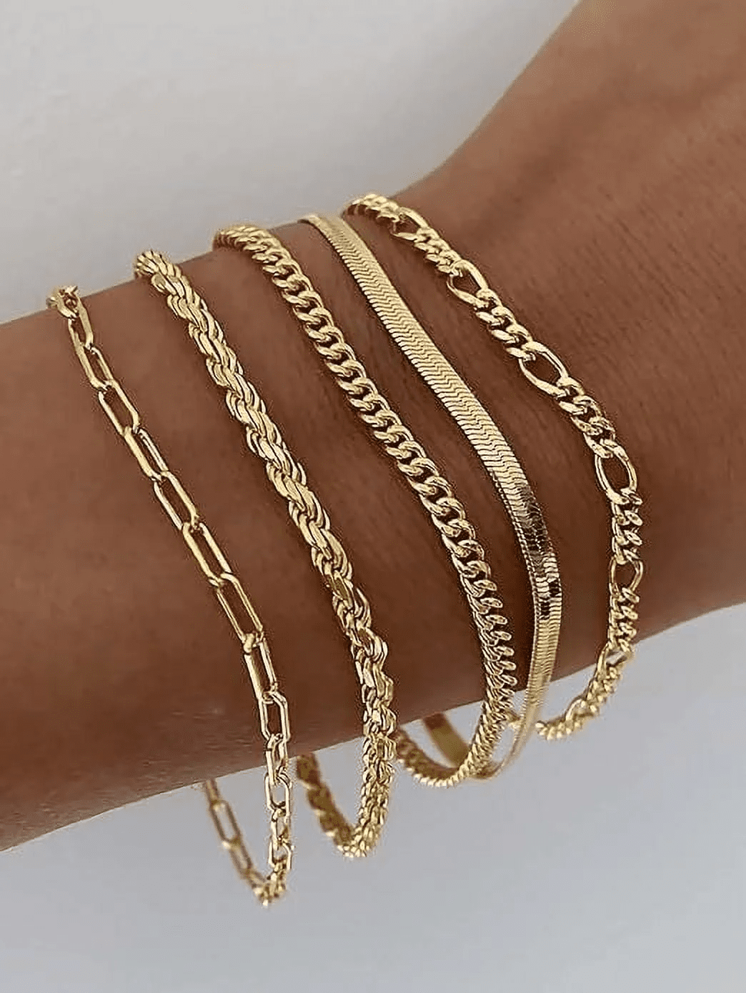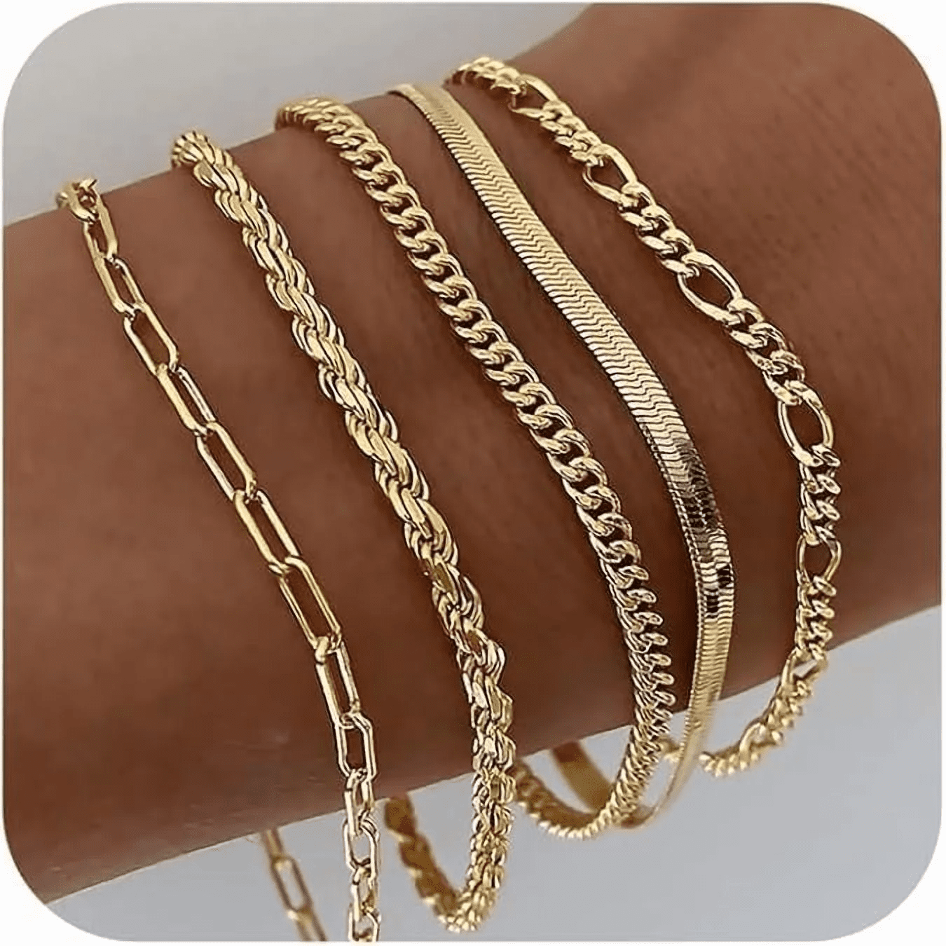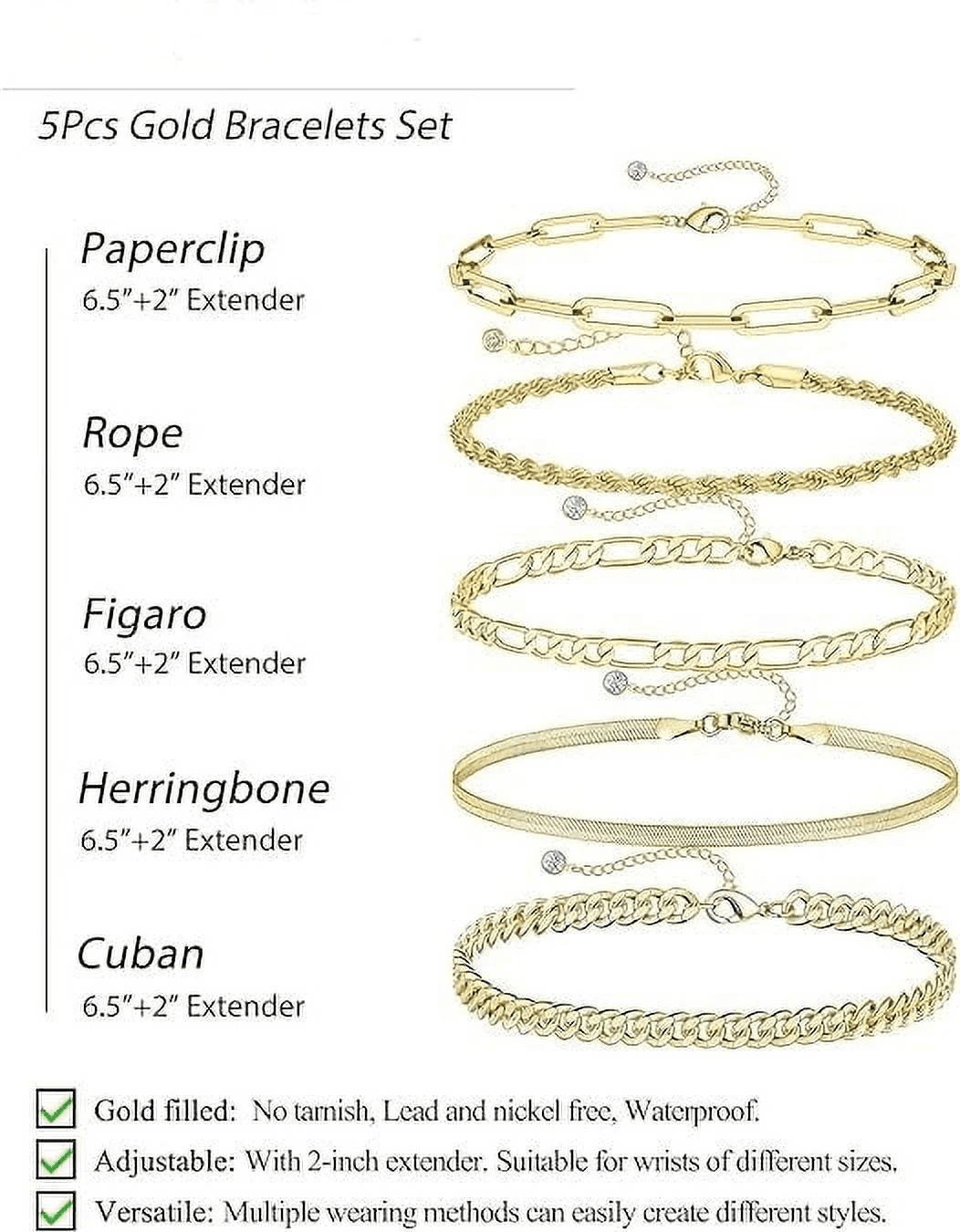 - 💛【5Pcs GOLD BRACELETS SET】Set contains: ①Figaro Bracelets ②Cuban link Bracelets ③Herringbone Bracelets ④Paperclip Bracelets ⑤Rope Bracelets. These Bracelets are suitable for layering as well as being worn alone.