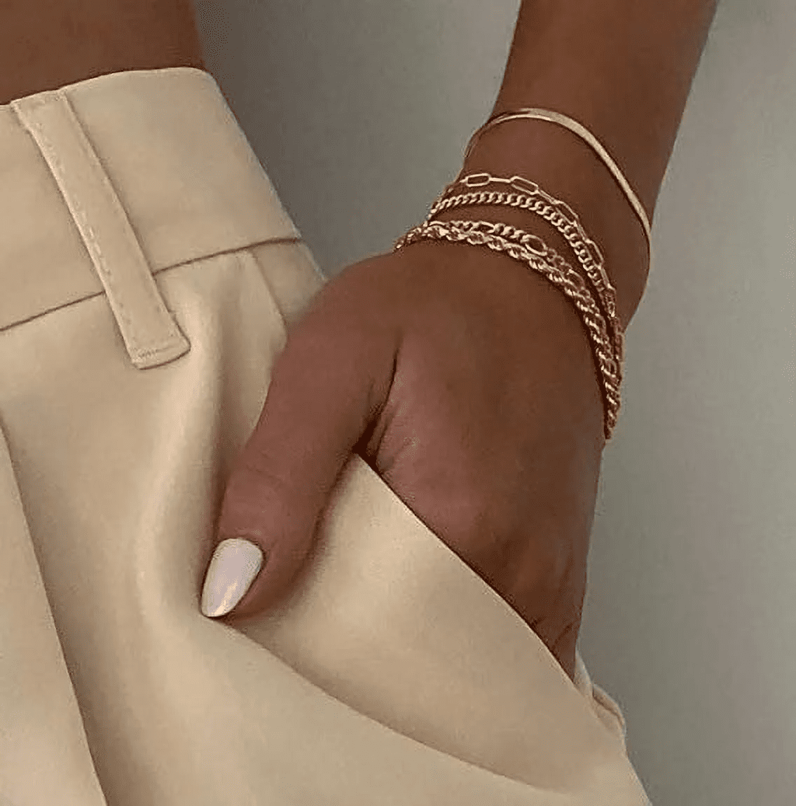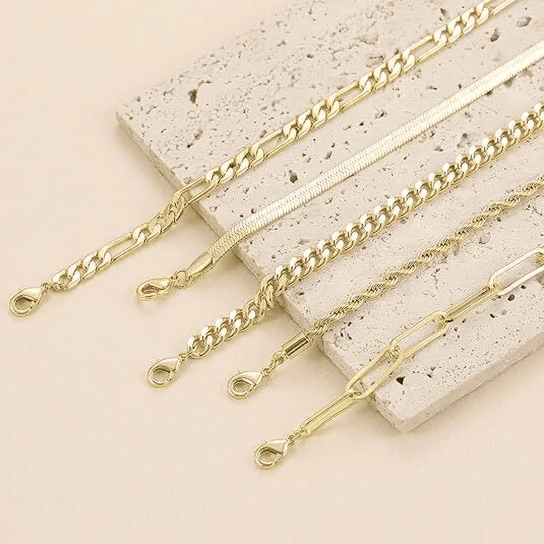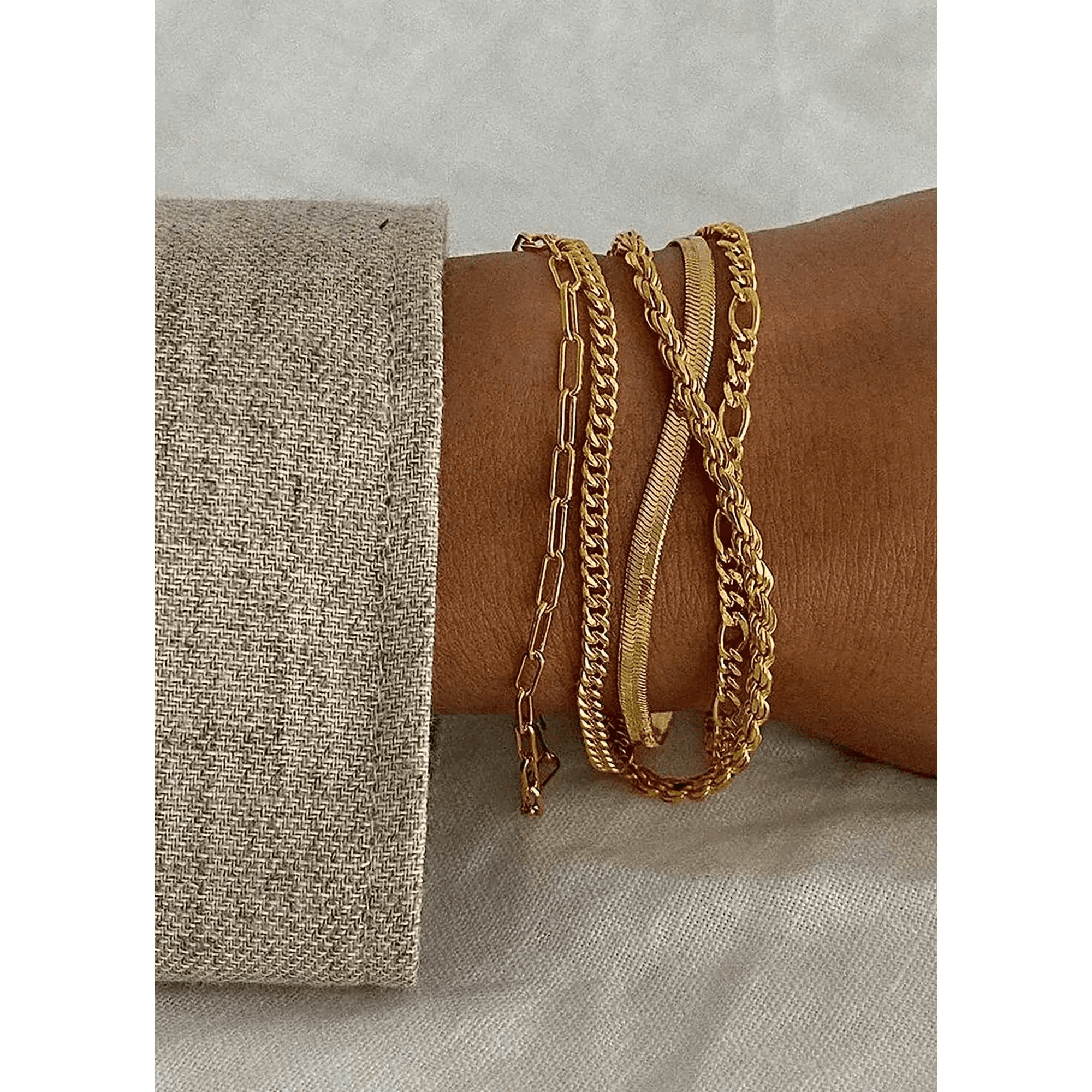 - 💛【5Pcs GOLD BRACELETS SET】Set contains: ①Figaro Bracelets ②Cuban link Bracelets ③Herringbone Bracelets ④Paperclip Bracelets ⑤Rope Bracelets. These Bracelets are suitable for layering as well as being worn alone.