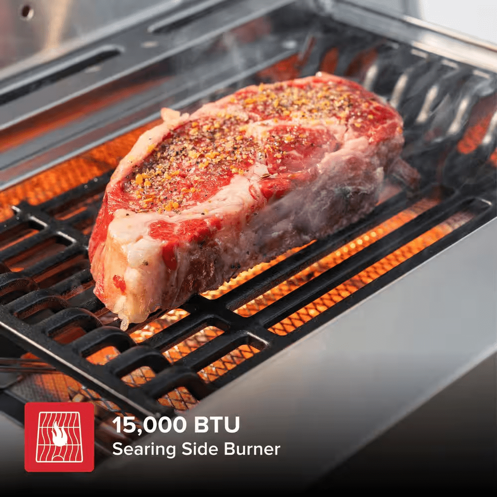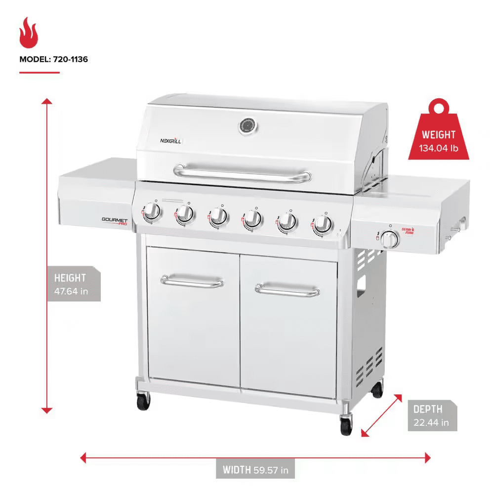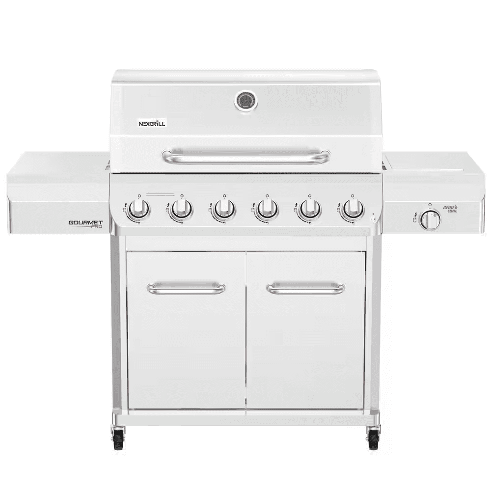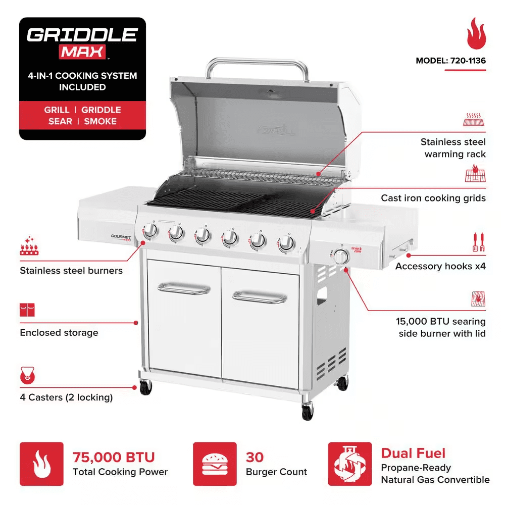Experience grilling like never before with the Nexgrill Gourmet Pro 6-Burner Dual Fuel Gas Grill in Stainless Steel with Searing Side Burner. Offering an expansive 804 sq. in. of total cooking space, this powerhouse features 6 main burners and a searing side burner that deliver a combined 75,000 BTU of flame-roasting energy. The innovative even heat cooking system, complete with stainless steel burners, angled flame tamers, and porcelain-coated cast-iron cooking grids, ensures consistent heat distribution across the entire grilling surface while minimizing flare-superelevated your culinary skills with the Griddle Max Cooking System, which allows you to not only grill but also salute, griddle, and smoke, providing you with the versatility to cook restaurant-style cuisine. The electronic ignition system ensures instant startup, while the upper-level warming rack keeps buns and food perfectly toasty. Designed for both convenience and performance, this grill features casters for easy mobility and a built-in thermometer for precise temperature control. Although initially set up for use with liquid propane, the Gourmet Pro’s dual-energy gas valves make it easy to convert to your home’s natural gas line. Transform your backyard into the ultimate grilling destination with the Nexgrill Gourmet Pro 6-Burner Gas Grill in Stainless Steel with Searing Side Burner, featuring the Griddle Max Cooking System.
