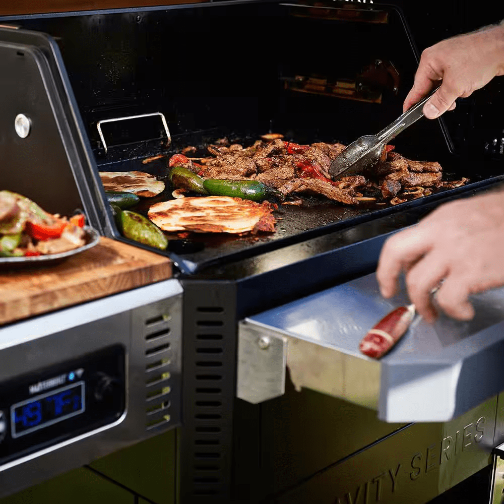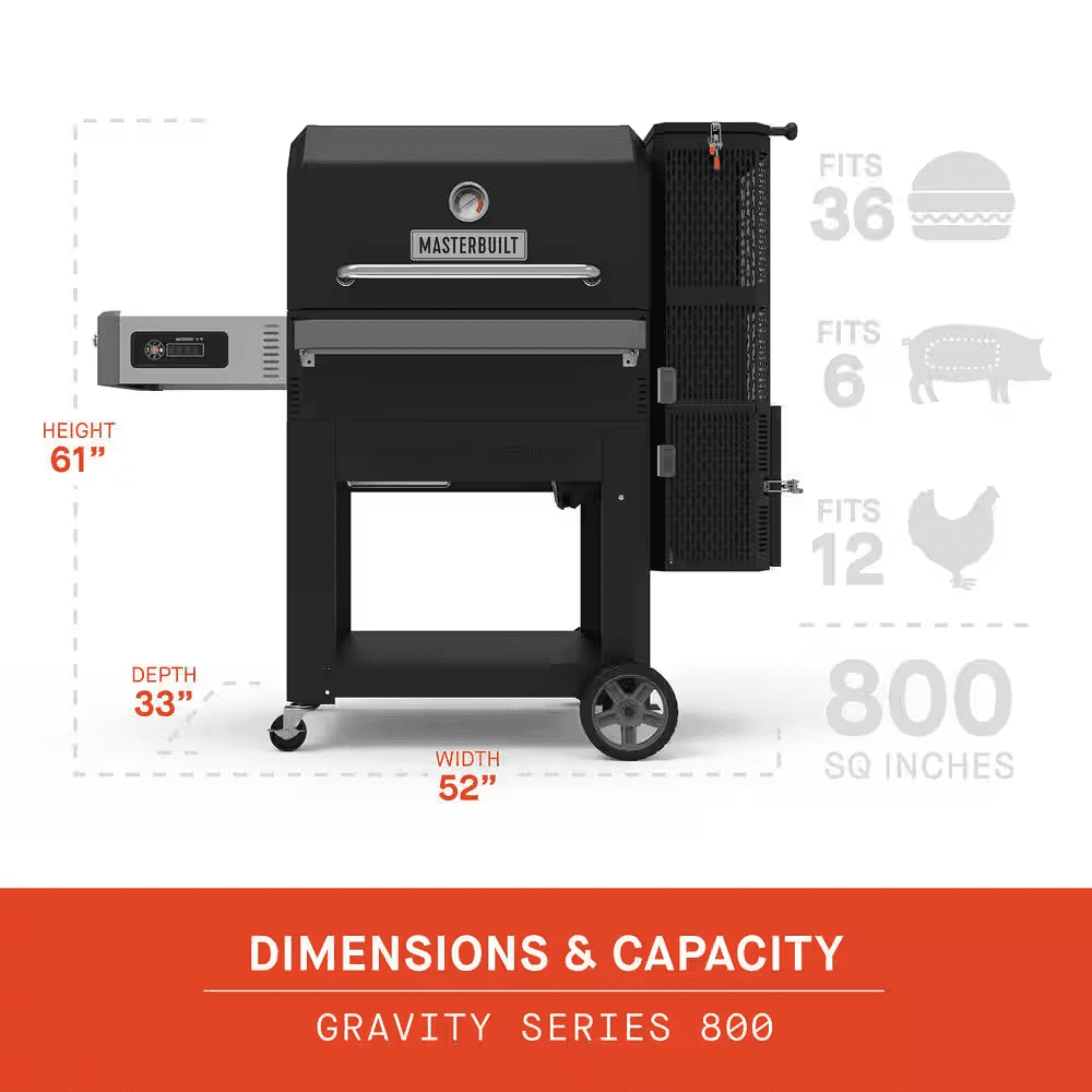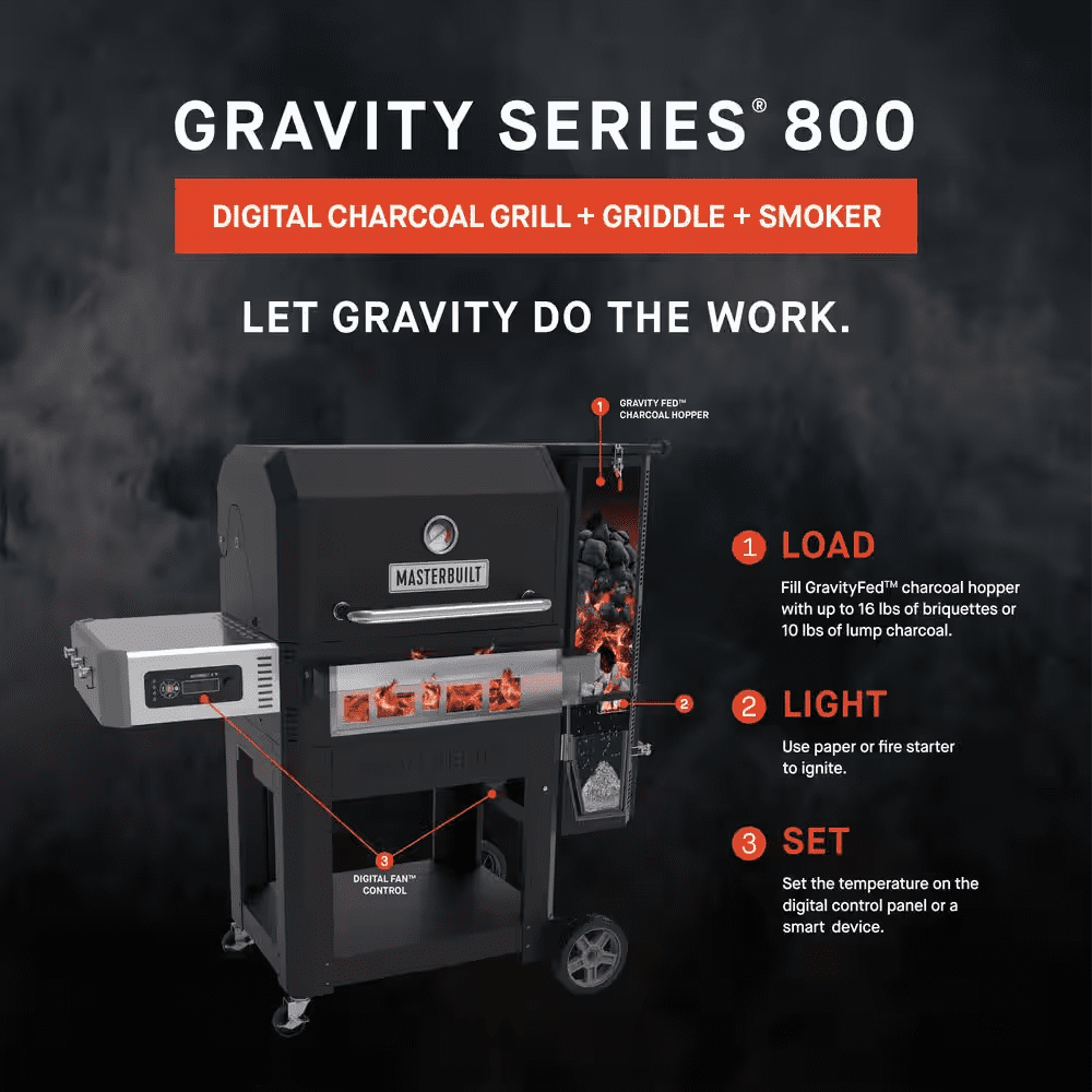 Get ready to take your charcoal grilling experience to new heights with the Masterbuilt Gravity Series 800 Digital WiFi Charcoal Grill, Griddle and Smoker. With cutting-edge technology and ultimate versatility, this charcoal grill will easily be your all-in-one outdoor grill and smoker all year long. Simply fill the GravityFed vertical charcoal hopper with charcoal, set your cooking temperature on the digital control board or on your smart device using the Masterbuilt app, and let Gravity do the work. Additionally, the Gravity Series 800 includes a flat-top griddle insert to sear and sauté breakfast, burgers, fajitas and more. Master the art of charcoal grilling and smoking with Masterbuilt.
