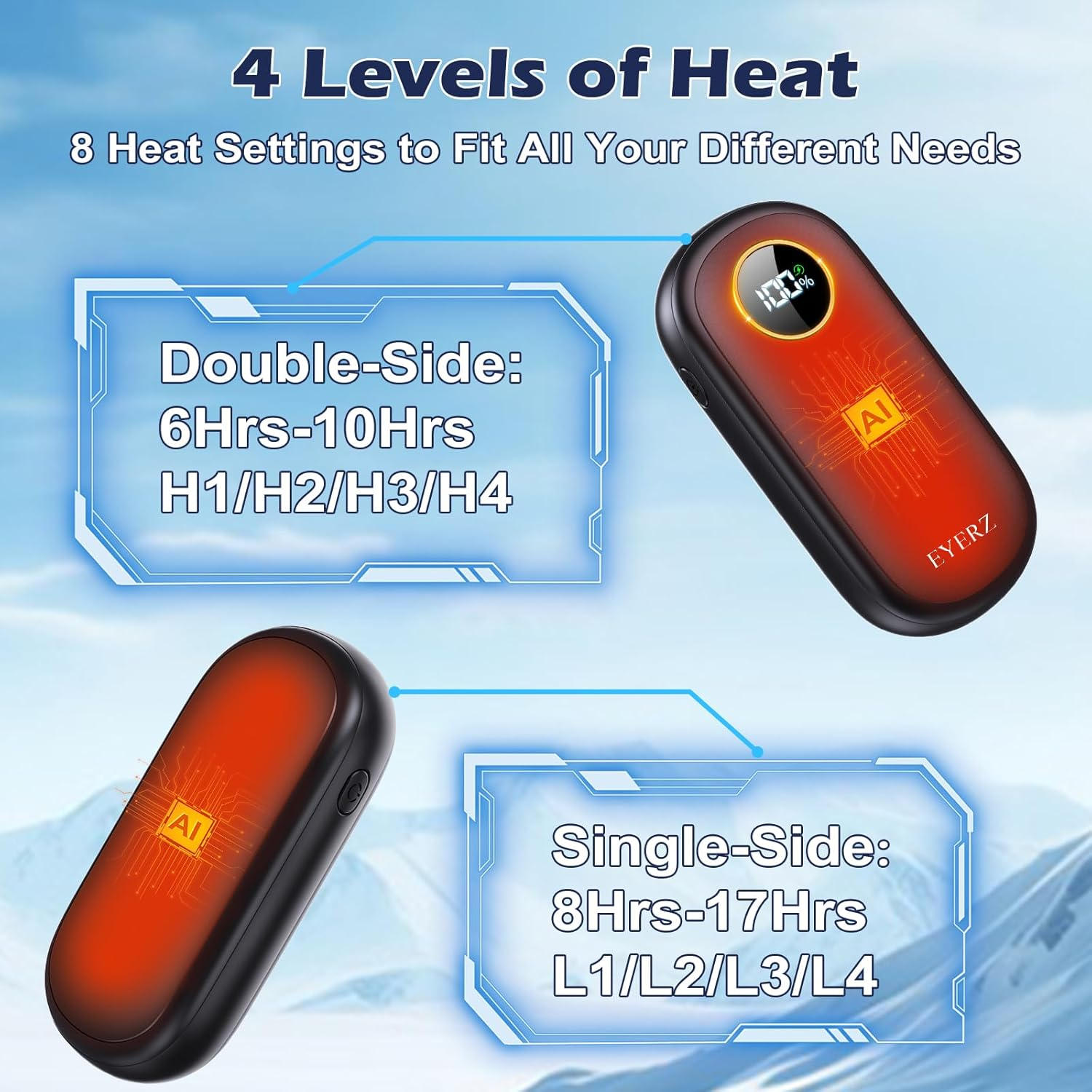 - 【Dual-Side Instant Heat】Get instant warmth in just 2 seconds. These hand warmers deliver consistent, comfortable heat—whether you’re camping and temperatures drop after sunset, or cheering at your kid’s outdoor football game as the night cools down, you’ll stay cozy. These rechargeable hand warmers feature 8 customizable modes (4 single-side/4 dual-side), making them perfect for everything from a gentle warmth during a morning walk to maximum heat during an ice fishing trip.