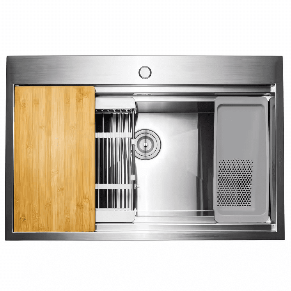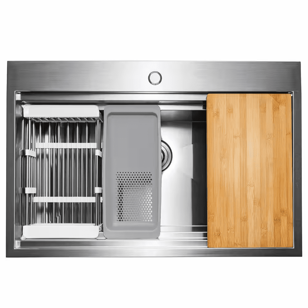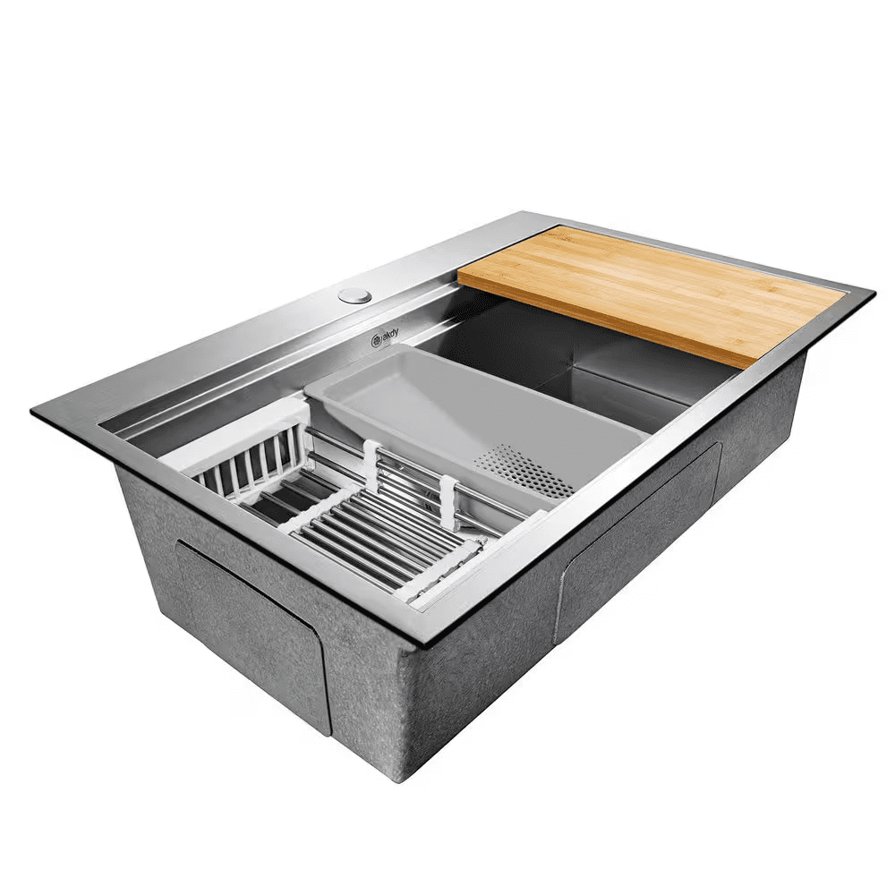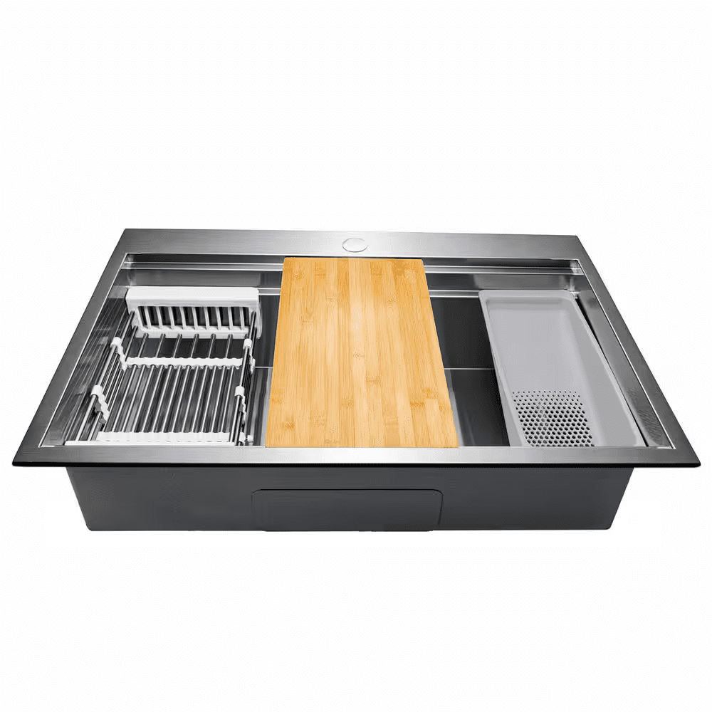This Handmade Workstation Ledge Stainless Steel Sink with Faucet combo is revolutionary to say the least. This Workstation Sink with integrated ledge that allows you to slide accessories across the sink to personalize the space. You get all of the beauty of a designer stainless steel sink while meeting your everyday kitchen needs. It is as functional as it is fabulous. We designed this elegant stainless steel kitchen sink to streamline your workflow by providing you a workstation that has everything you need!
