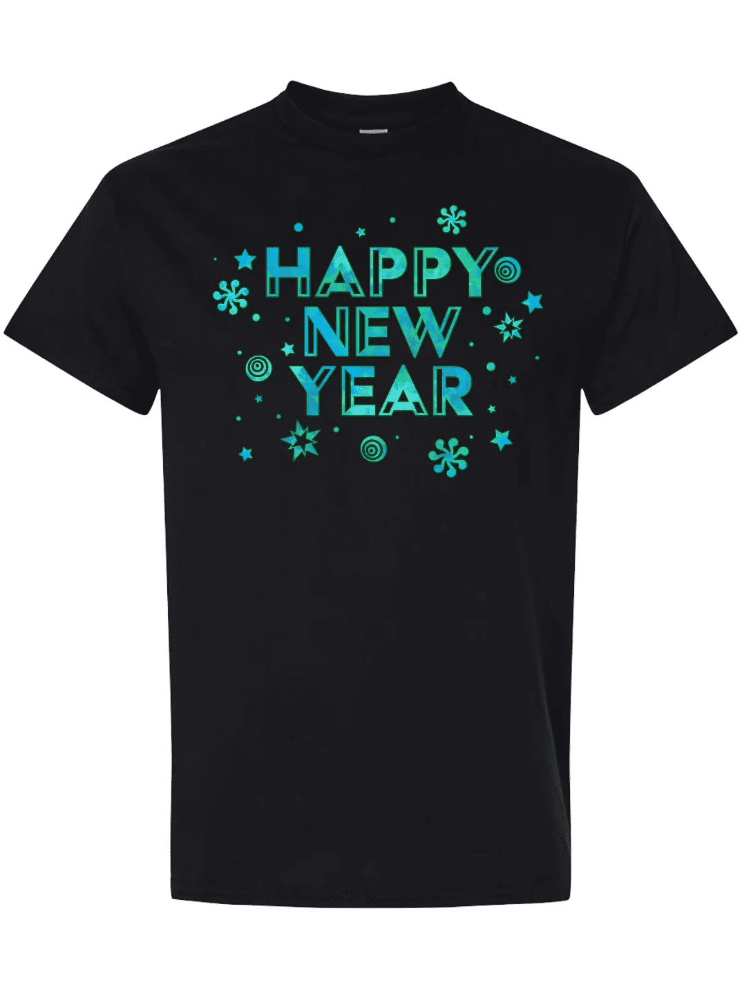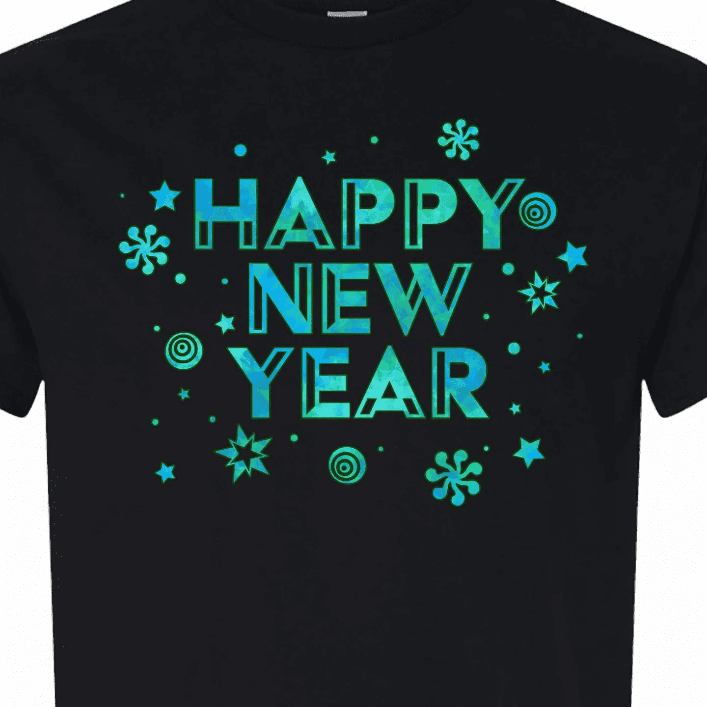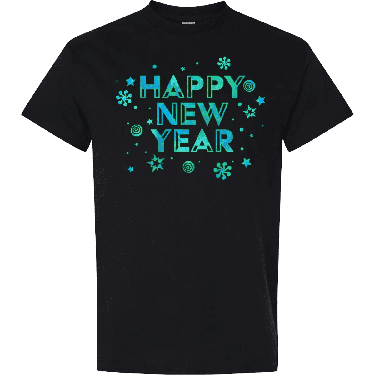 Happy New Year T-Shirt. Wardrobe essential for looking good, 24/7. 5.0 oz., pre-shrunk 100% cotton. Seamless 1×1 rib collar. Shoulder-to-shoulder taping. Double-needle stitched sleeves, bottom hem and front neck. Note: greys are a cotton/polyester blend. T-Shirt.