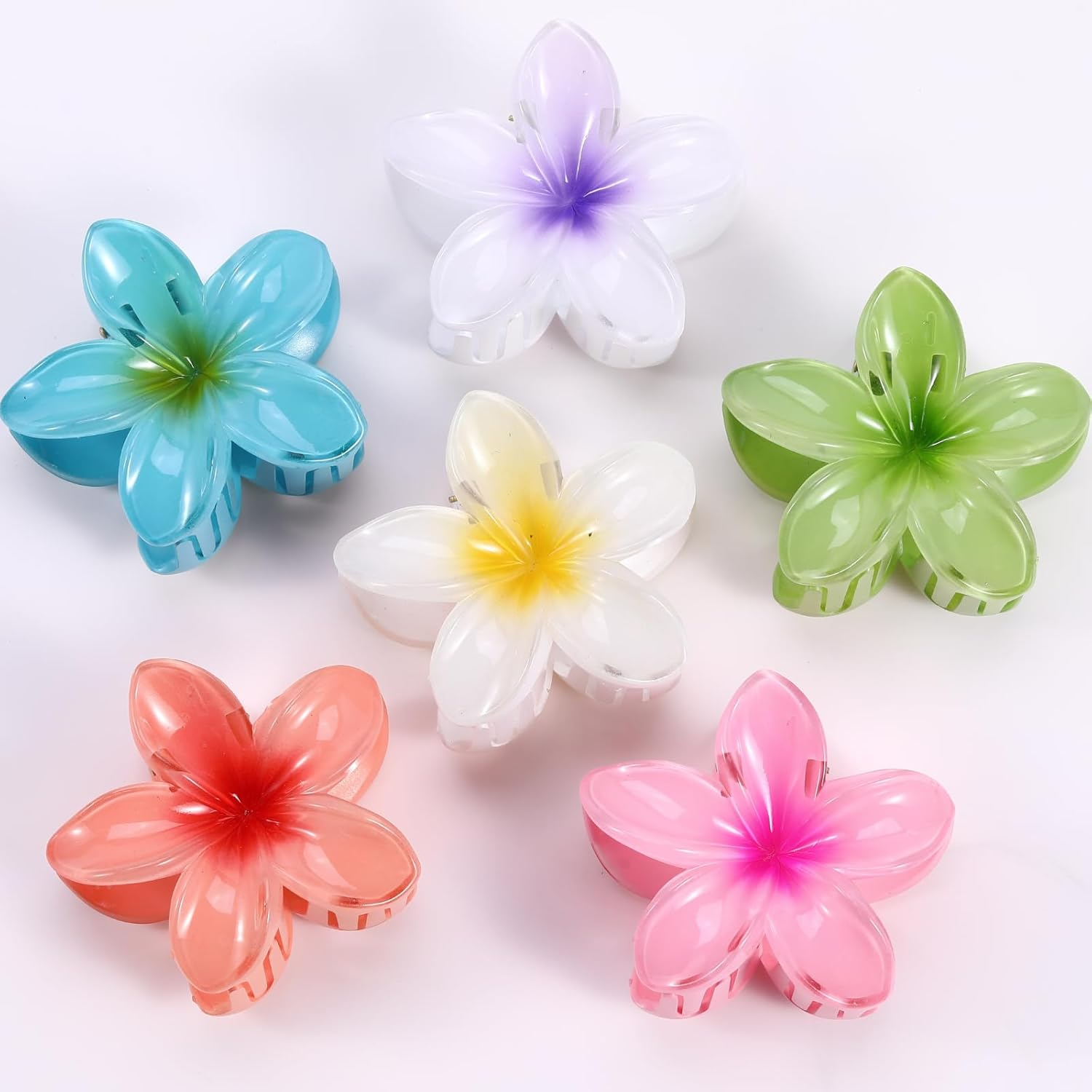 - 🌼 Aesthetic & Trendy Flower Design Inspired by tropical Hawaiian plumeria, these colorful claw clips bring a cute and beachy vibe to your everyday hair styling. Perfect for vacation, summer, or daily outfits.