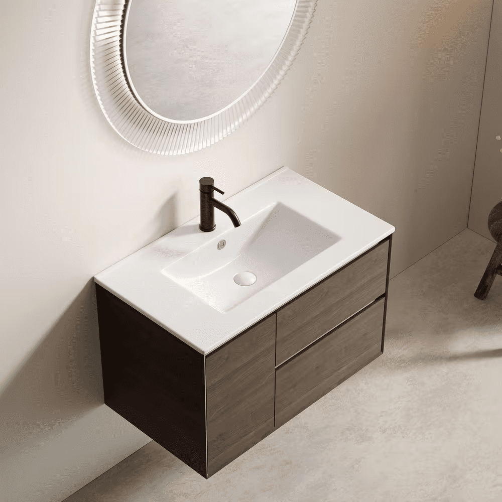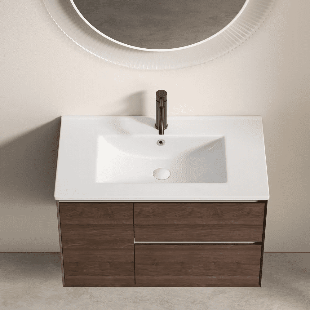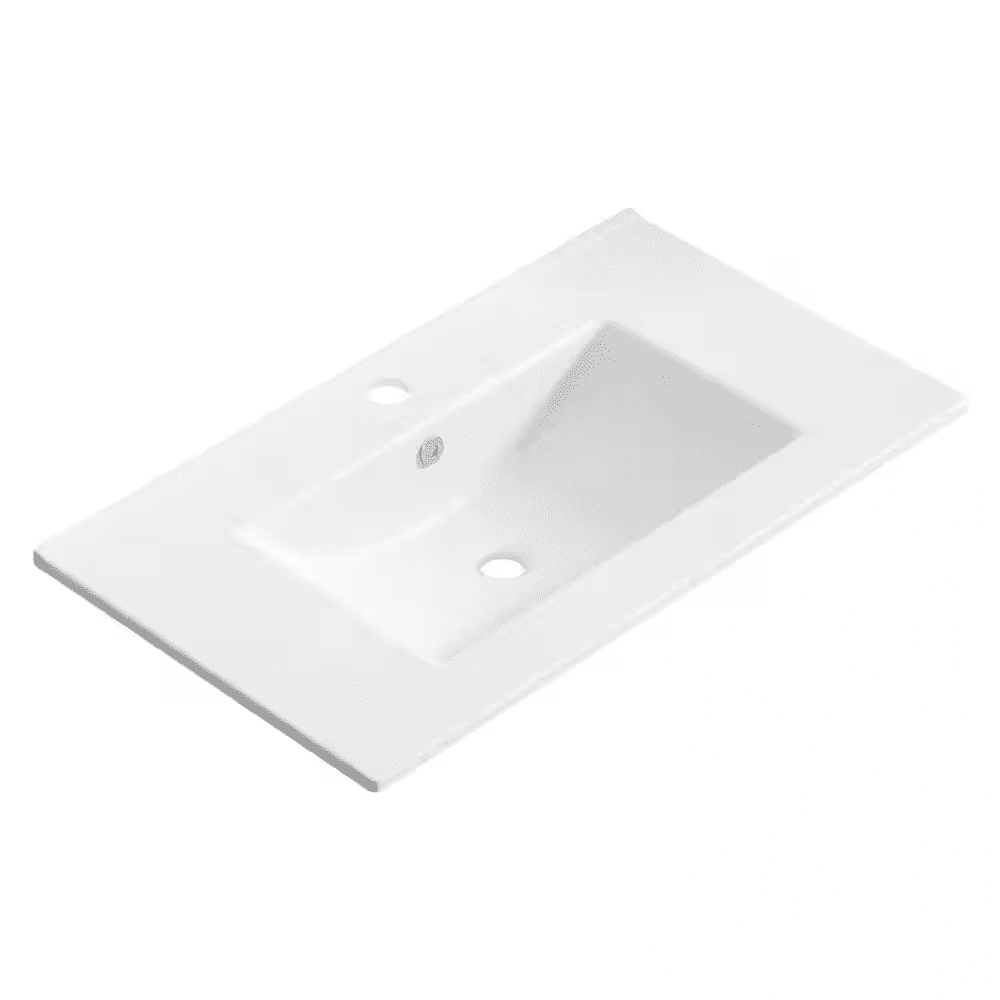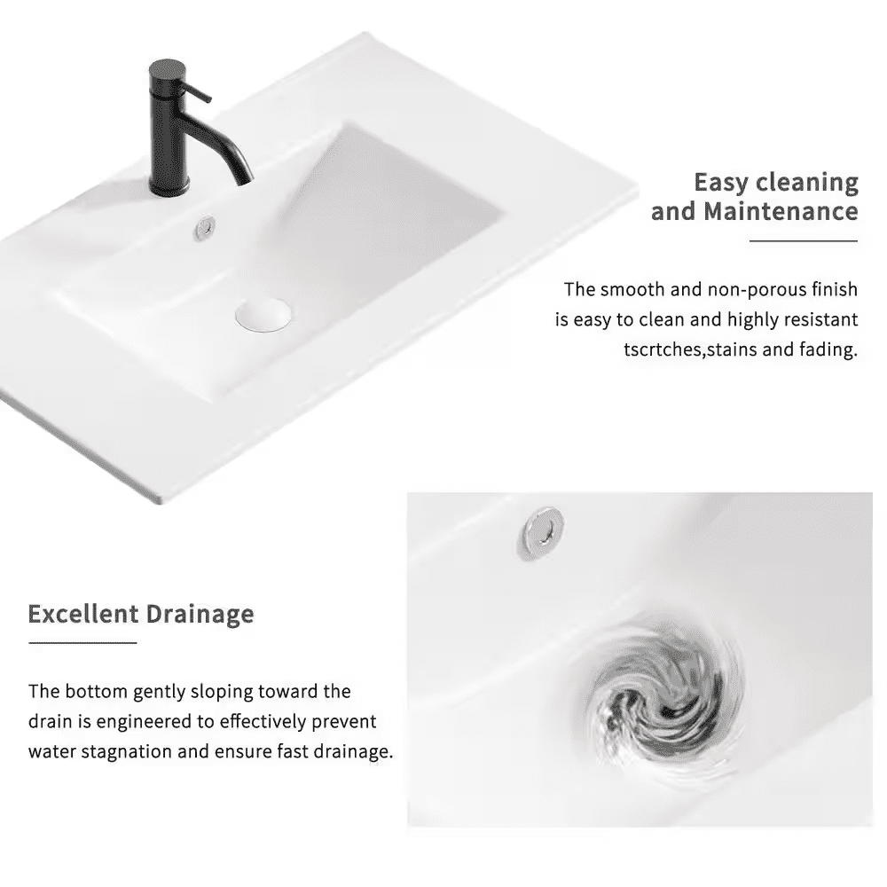 This modern Sink is made of high-quality ceramic and is fired at an ultra-high temperature of 1280°C, offering excellent resistance to fading, scratch resistance, and cracking. It is durable and easy to maintain. The simple Rectangular sink body and pure white design give it a versatile modern aesthetic, making it easy to blend into various bathroom styles. The artificial marble countertop has a dense surface that is resistant to stains and can be easily cleaned with a damp cloth and non-abrasive soap. The thoughtful pre-drilled center hole design makes installing standard faucets simple and quick.