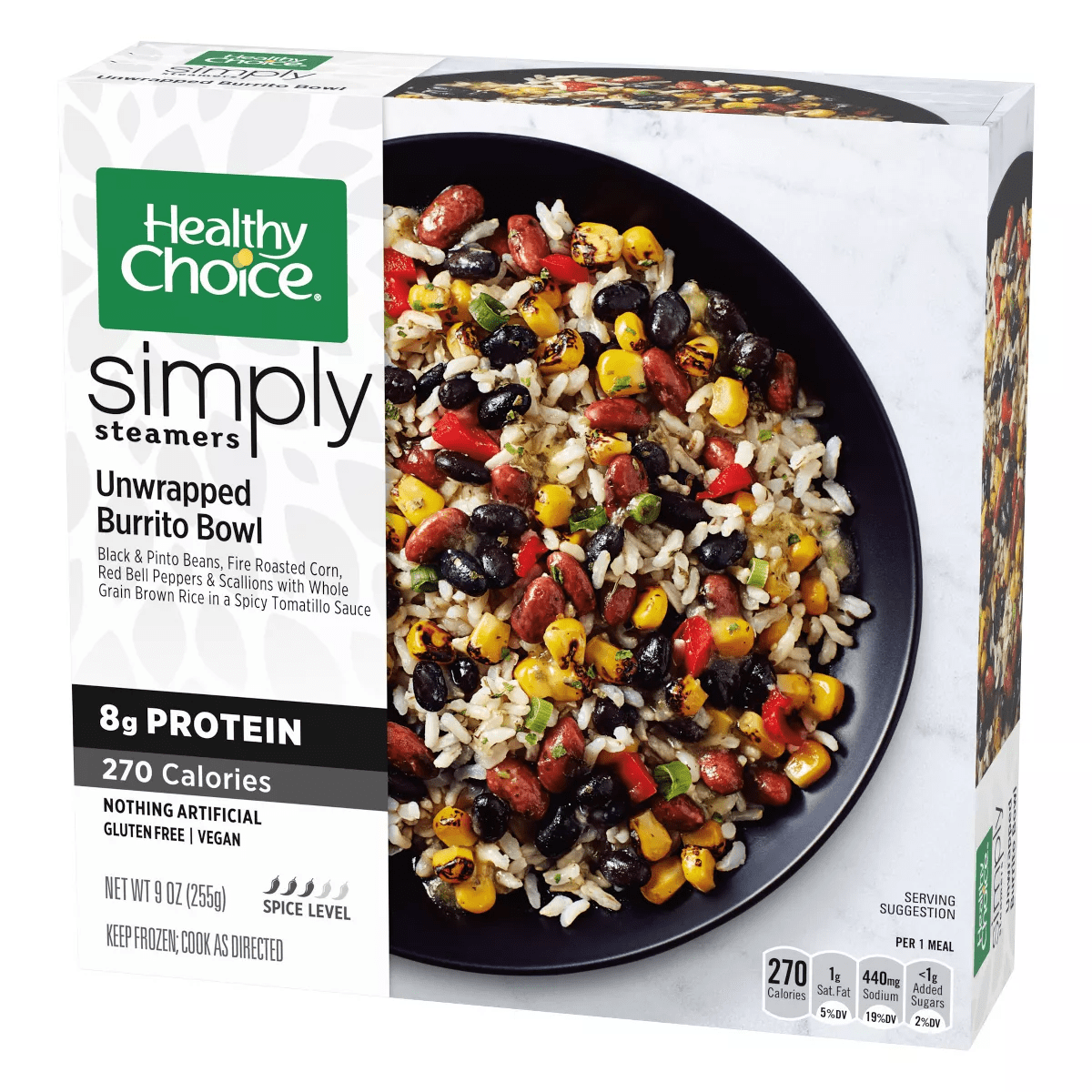 - Contains one 9-ounce Healthy Choice Simply Steamers Unwrapped Burrito Bowl Frozen Meal