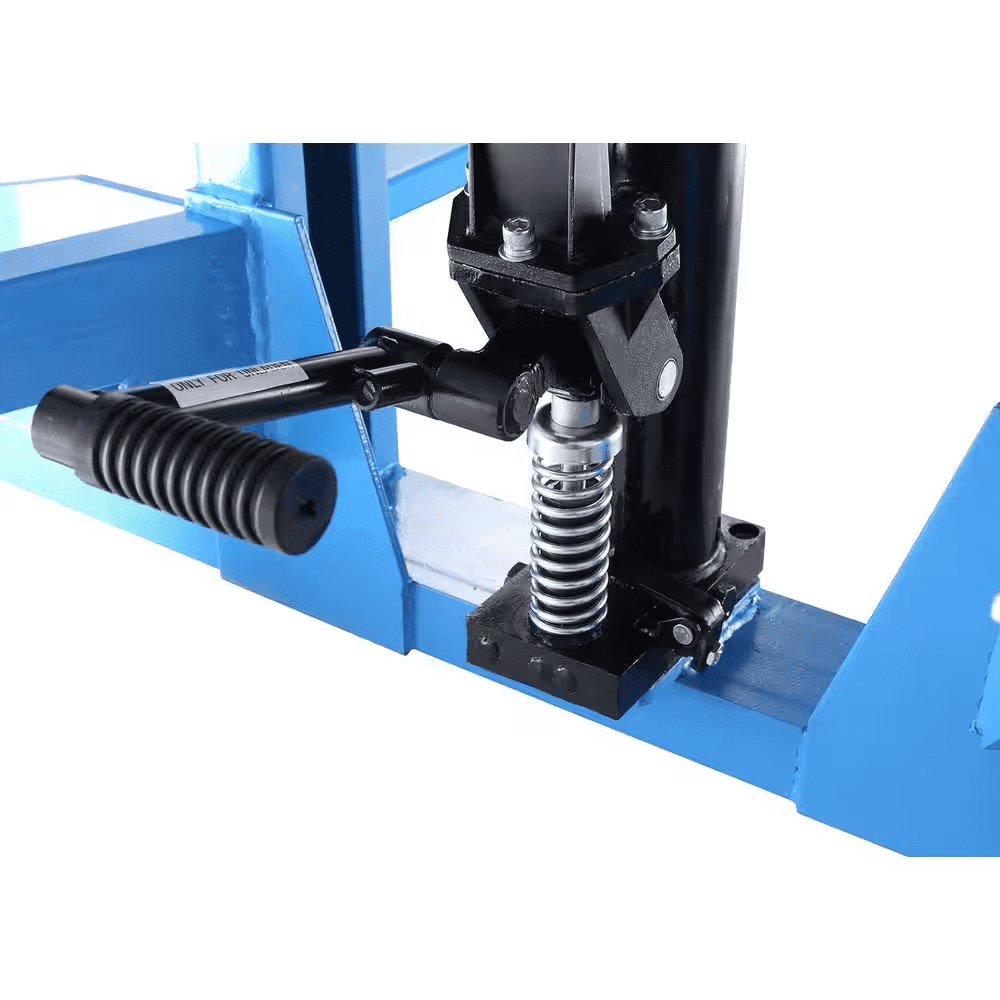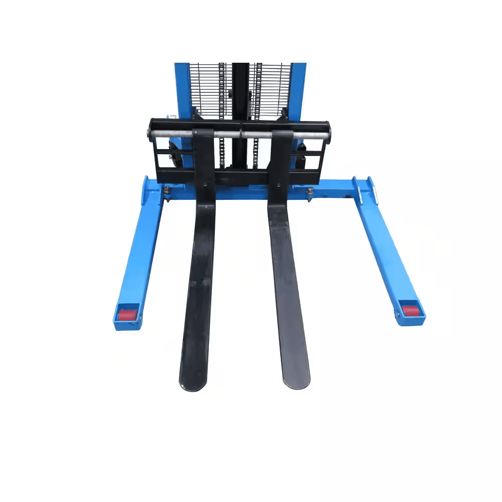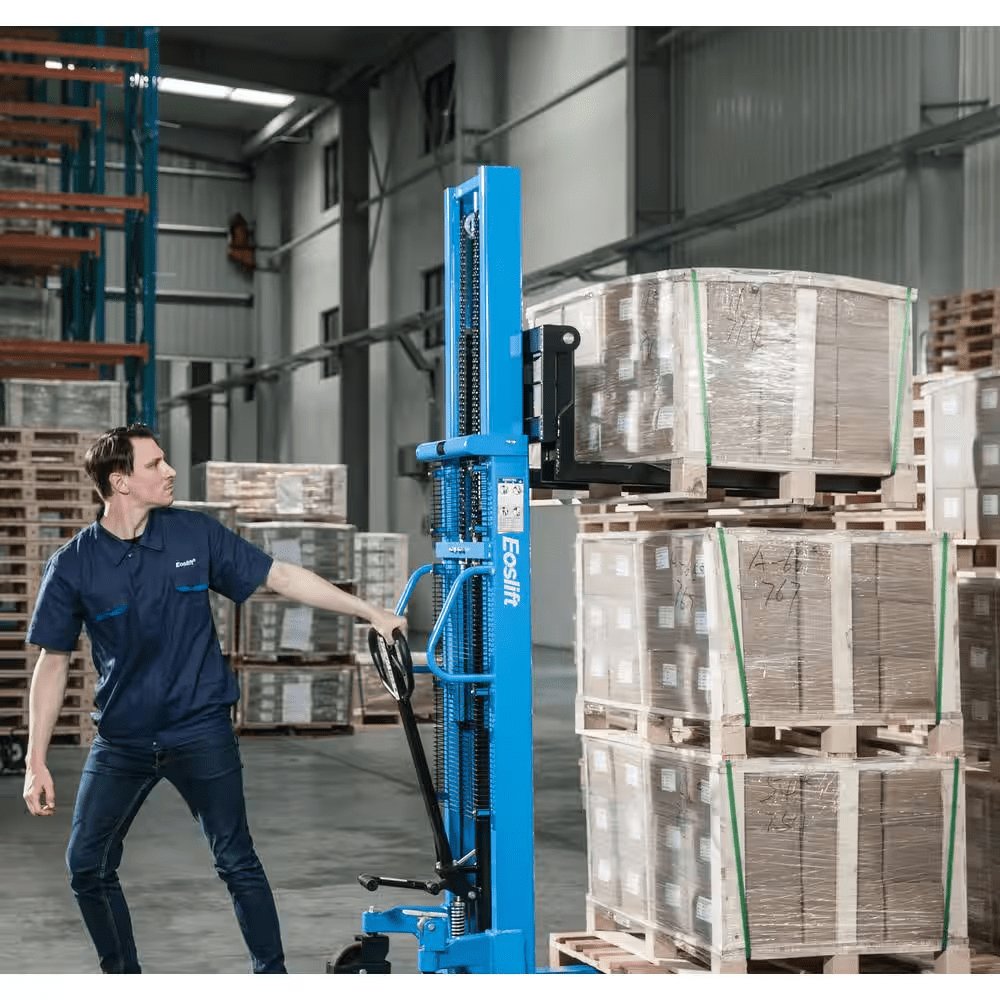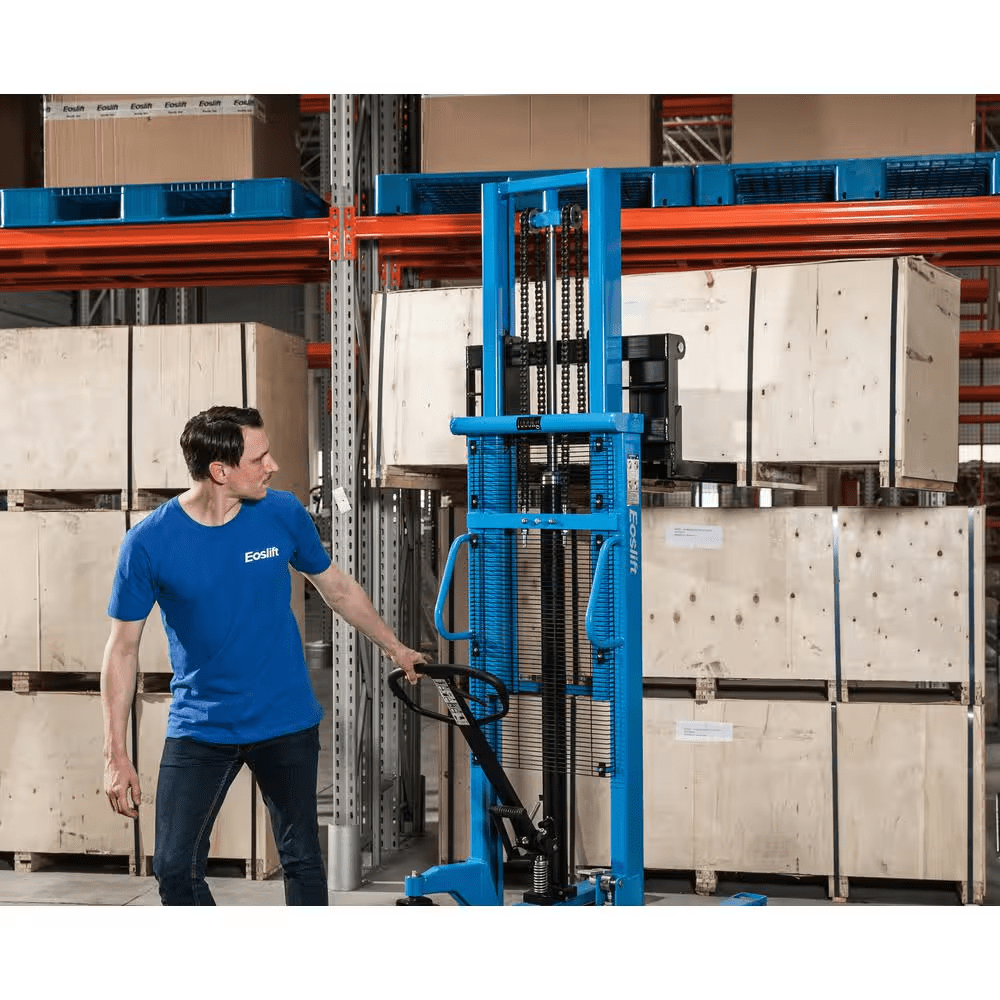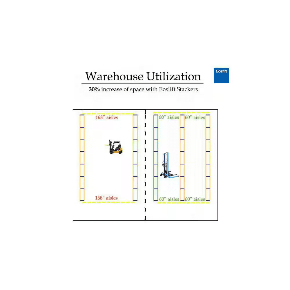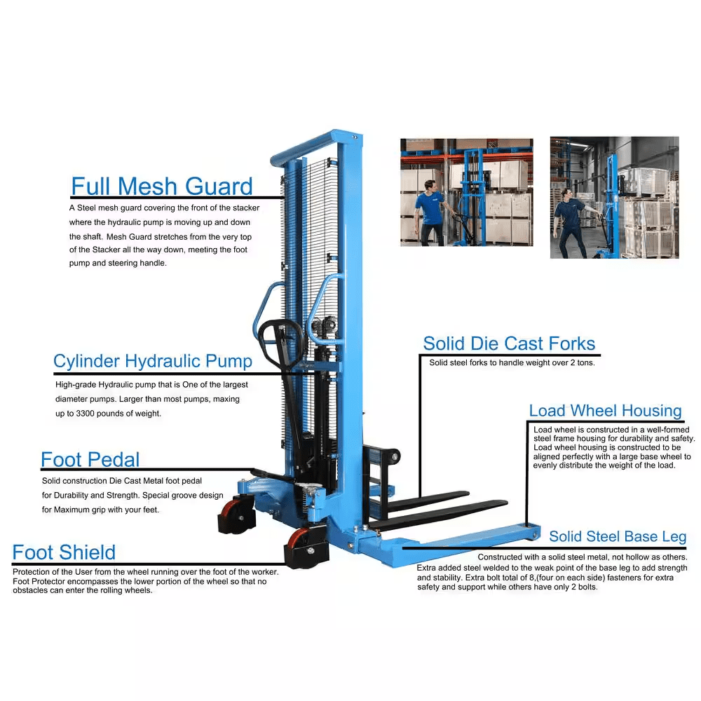Eoslift USA Heavy Duty Grade Manual Solid Steel Adjustable Base Leg Straddle Pallet Stacker is constructed with only high-quality materials and craftsmanship. 2200 lbs. weight Capacity., 63 in. Raised Ht., Polyurethane Wheels, Steel Hubs, Padded Handles, Hand and Foot Pump, 3 Years Limited Warranty.