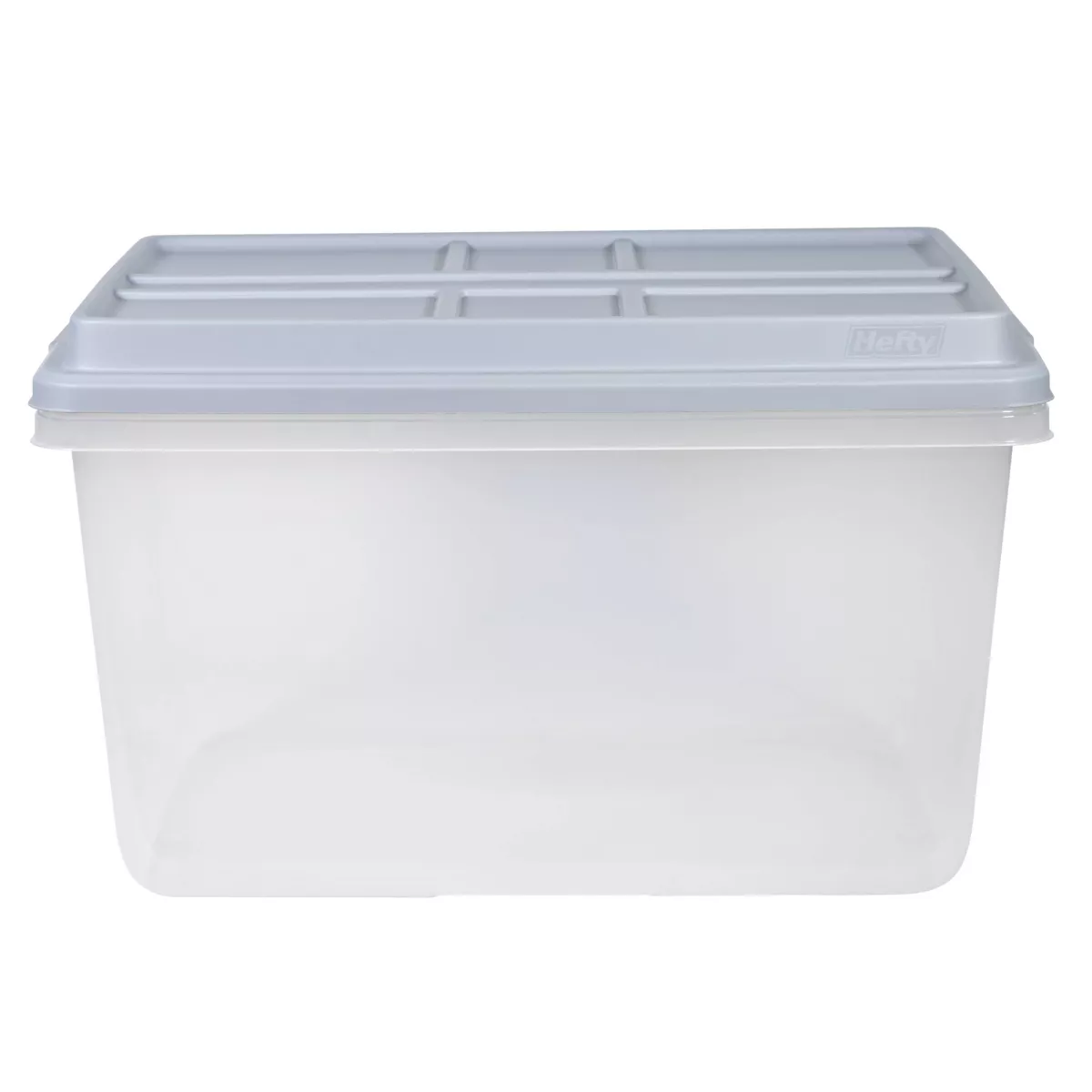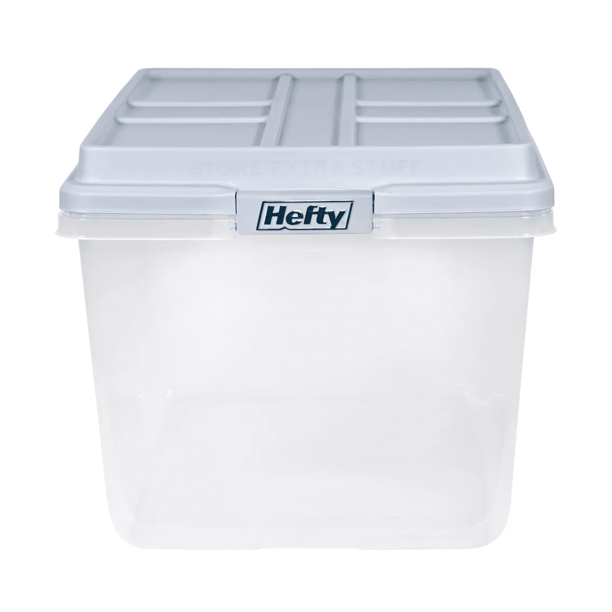 Hefty – The Toughest Name in Storage. The newly redesigned XL clear plastic storage container by Hefty has a stackable, taller lid allowing you to store taller items and extra stuff. The XL lid locking handles create a tighter close to help protect your valuables. The HI RISE storage box collection is available in a clear base to easily find your stored items, complete with a light gray lid and teal metallic like handle for a decorative look. Use storage container alone, within storage closets or on various shelf organizers. Get organized by storing winter or summer clothing, crafts, extra blankets & linens or extra pantry items. Perfect for garage storage, closet storage, basement storage, bedroom and other spaces within your home. Look as good as being organized feels by purchasing this and other sizes within the HI-RISE collection. Inner Dimensions: 18.75″ L x 12.19″ W x 12.34″ H. Outer Dimensions: 23.95″ L x 16.81″ W x 14.24″ H
