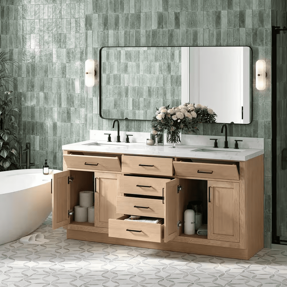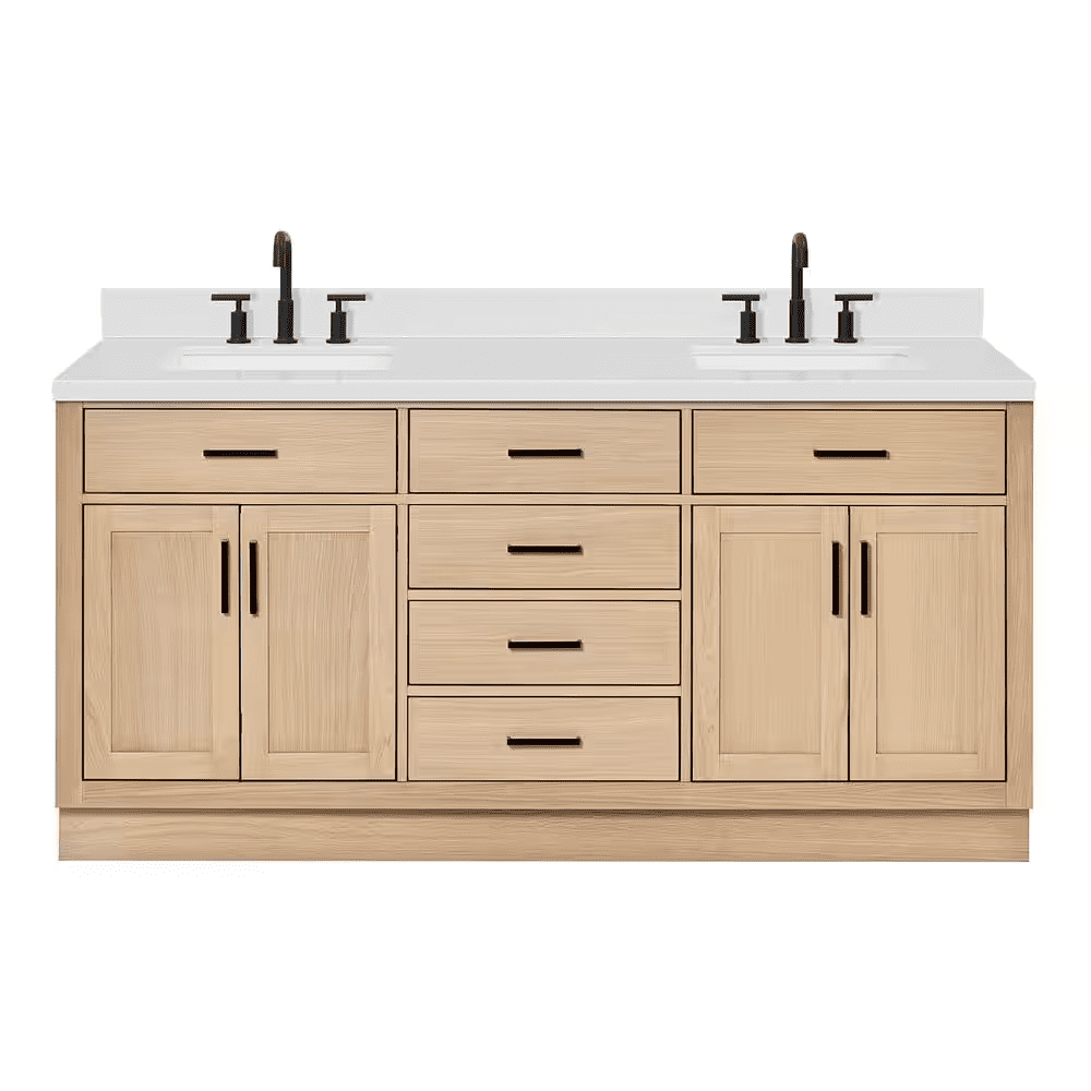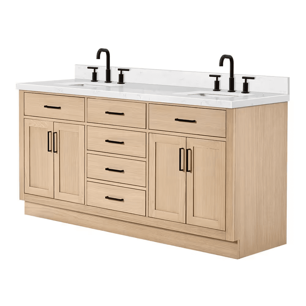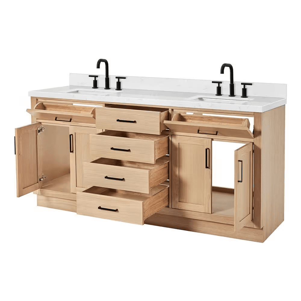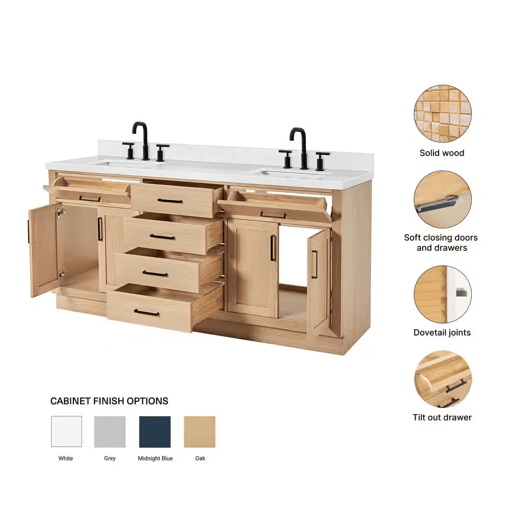 The ARIEL Hepburn Collection blends modern design with everyday function, making it a popular choice for today’s bathroom remodels. Upgrade your bathroom with the ARIEL Hepburn 72 inch bathroom vanity in oak, a perfect blend of style and function. This double bathroom vanity with sink is handcrafted from high-quality solid wood and plywood for lasting durability and strength. The cabinet offers functional countertop space and organized storage, making it a reliable choice for keeping your bathroom clean and updated.
